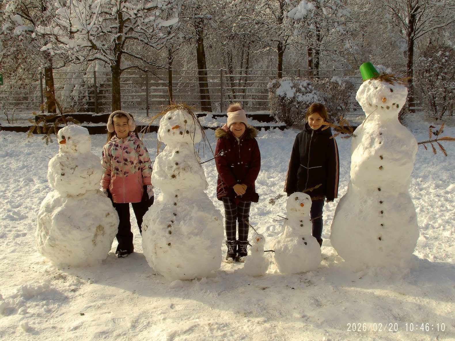 Am letzten Ferientag tobten sich alle Hortkinder im traumhaft winterlich verschneiten Hortgarten aus, genossen das Draußensein und erschufen eine ganze Schneefamilie.