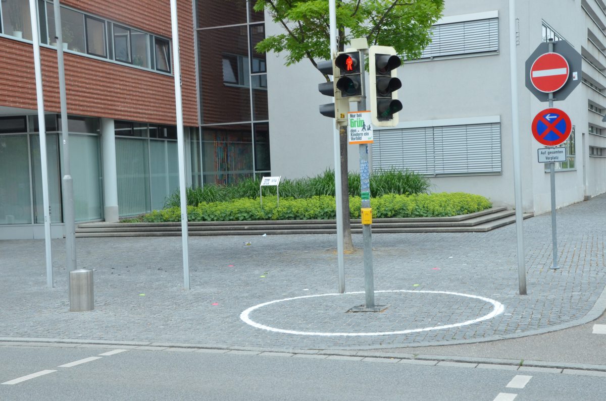 Diese Kreise an der Theresienstraße beim Übergang zur Schule dienen zur Einhaltung der Abstandsregeln in Zeiten von Corona.