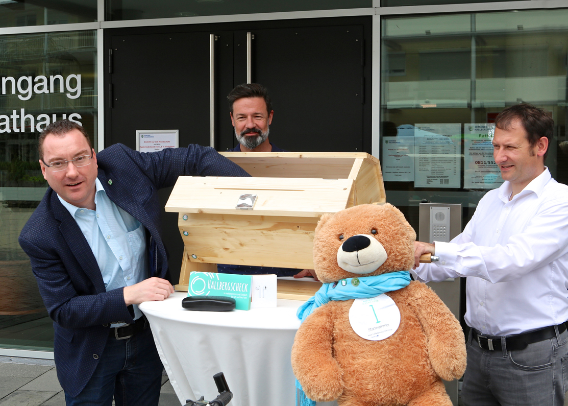 Der Vorstand der Werbegemeinschaft Hallbergmoos in Aktion baute am 3. Juli 2020 kurzerhand die Lostrommel samt Gewinnen vor der Rathaustür auf. Als diesjährige „Glücksfeen“ luden sie den Ersten Bürgermeister Harald Reents und Geschäftsleiterin Julia Hollmer ein. Diese kamen natürlich sehr gern und zogen kurz vor 12 Uhr abwechselnd die ersten Gewinne. Die Gewinner der sieben Hallbergschecks wurden zuerst aus der hölzernen Trommel gefischt.