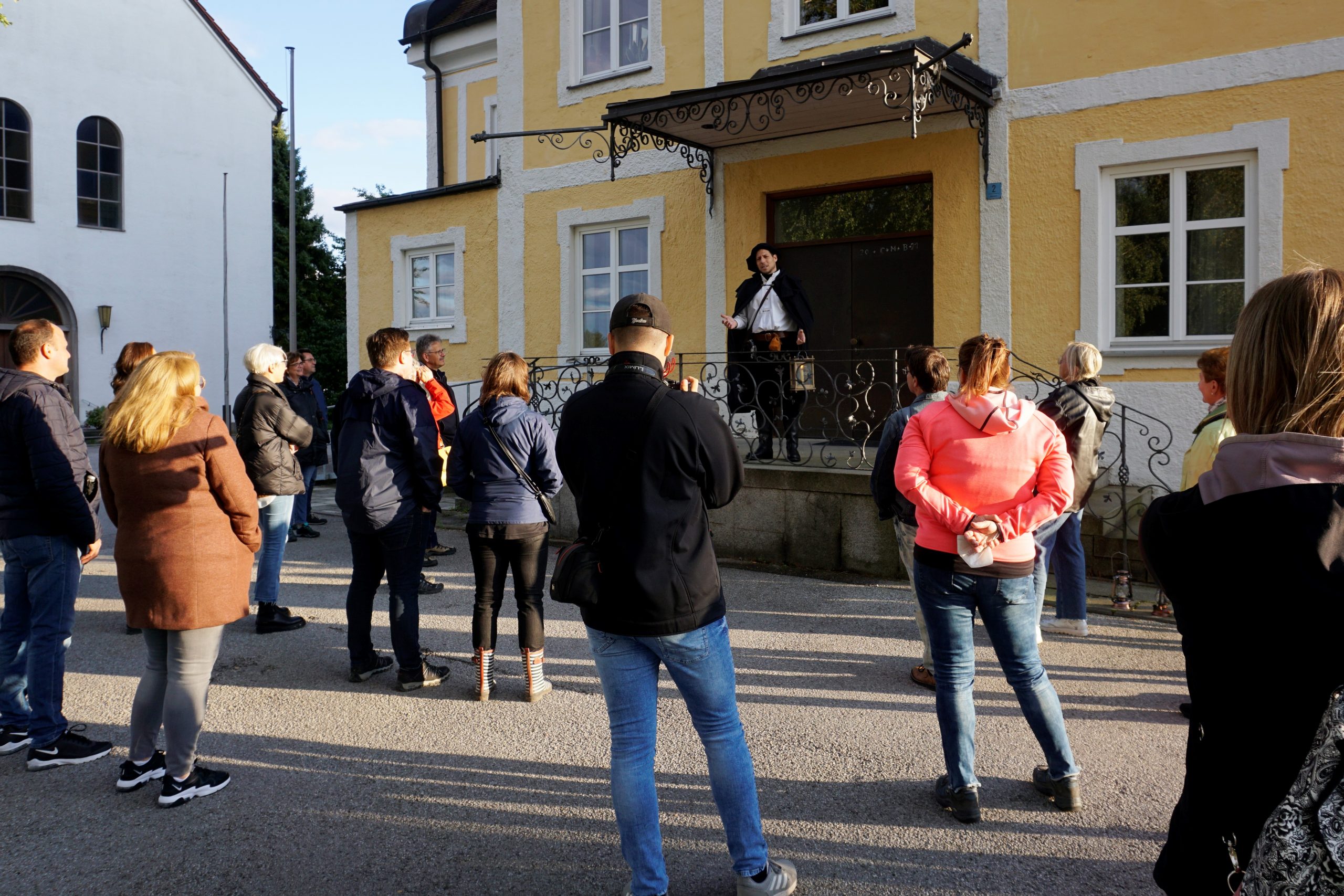 Die Sonne steht schon tief, jetzt im Spätsommer und hüllt Schloss Birkeneck in sanftes Licht, als sieben Schläge der Kirchenglocke den Übergang vom Tag zur Nacht ankündigen. Eine Gestalt im langen schwarzen Umhang tritt auf und mahnt mit lauter Stimme rund 25 Anwesende zur Aufmerksamkeit. „Hört, hört“ ruft Nachtwächter „Schuki“ alias Martin Schuster, zweiter Vorstand der Moosbühne Graf Hallberg, in die Menge. Mit fester Stimme und Laterne in der Hand, erzählt „Schuki“ vom ehemaligen Jagdschloss, inmitten von Moorflächen errichtet, wie es in den Besitz des skurrilen Ortsgründers Theodor Maria Hubert Isidor Freiherr von Hallberg-Broich, auch bekannt als Eremit von Gauting, kommt und einem Schmugglergang, der in das angrenzende Birkenwäldchen führt. „Mehr Information hatte ich nicht, aber es hat mich inspiriert einen Faden zu spinnen. Bei unserer Nachtwächterwanderung handelt sich um überlieferte und belegbare Geschichten und gespielten Szenen, die ich dazu passend erfunden habe“, erzählt Initiator und Regisseur „Schuki“ von der kurzweiligen, rund fünf Kilometer langen, Tour durch die Historie des Ortes.
