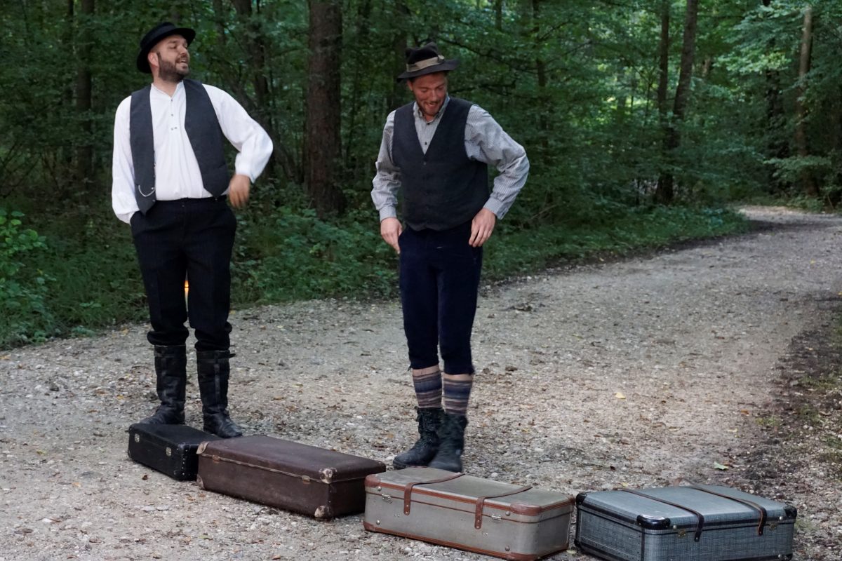 Die Ärmsten der Armen, auch Zuchthäusler, finden eine neue Heimat in Hallbergmoos, berichtet „Schuki“ aus den Annalen des Dorfes und warum die Freisinger immer gegen die Hallberger frotzeln: „Weil die es nicht so genau genommenen haben mit der Sauberkeit. Am Wochenmarkt haben sich Freisinger nach dem Handgeben mit einem Hallberger die Hände verstohlen abgewischt“, erzählt „Schuki“. Zwischendurch, bevor die Mirl (Christina Karl) und Sohn Karle Moitl (Jonas Karl) die Open-Air-Bühne betreten, schallt ein schriller Schrei durch die Dunkelheit – ein toller Special-Effekt: „Aber der kommt jetzt nicht von uns“, klärt Nachtwächter „Schuki“ lachend auf. Nur wenig später folgt ein noch speziellerer Effekt: die angekündigte Toilettenpause fällt wegen abgeschlossener WCs aus: „Das haben wir wohl vergessen, jetzt müssen wir zusammenzwicken“, kommentiert „Schuki“ das kleine Malheur, das vielleicht dem einen oder anderen auf die Blase drückt, aber keineswegs auf die gute Stimmung.