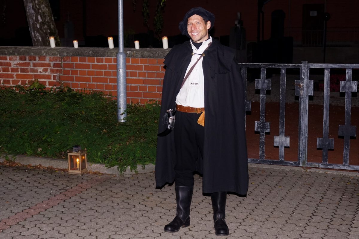 „Die Geschichte in Hallbergmoos ist vergleichsweise jung“, sagt der gebürtige Sünzhausener und passionierte Laienschauspieler. „Ich habe Material durchforstet, aber auch bei der Generalprobe noch Neues erfahren, was ich noch kurzerhand eingefügt habe, wie beispielsweise über das Raiffeisengebäude und einen ehemaligen Metzger oder das Polizeihäuschen.“ So begegnen den Nachtwanderern, mitunter recht plötzlich, manch zwielichtigen Gestalten, wie dem Hartl (Robert Walter), Jackl (Thomas Mach) und dem Capo (Harald Kindshofer) im Wald, die Frauen um ihren wertvollsten Besitz bringen, hören die Geschichte von Torfstechern, die in Gräben, bei stickiger Hitze mit handgeschmiedeten Werkzeug, bis zu 14 Stunden täglich arbeiten und ihren kargen Lohn umgehend in Bier umsetzen, ohne Rücksicht auf den Hunger ihrer stets schwangeren Frauen und großen Kinderscharen. Ein passendendes Stichwort für den Nachtwächter, der eine „knackige Pause“ ankündigt: „20 Minuten mit Brotzeit und Getränken!“ Schließlich sei Nachtwächterin und erste Vorsitzende, Christine Wimmer, mit ihrem „Fuß-Gefolge“ seiner ersten Gruppe dicht auf den Fersen. „Aber niemand muss schlingen oder die Halbe runterschwappen“, beruhigt „Schuki“ und ruft zum Wegbier auf: „Genusstrinker können ihre Flasche mitnehmen!“, bevor „Hochwürden“ Pfarrer Weiß (Helle Wolter) seinen Schäfchen die Leviten liest, da etwas sehr Verwerfliches passiert sei.