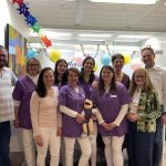 Dr. Beatrice Heineking mit Praxisteam, Bürgermeister Benjamin Henn, Tanja Knieler und dem Praxis-Maskottchen bei der Eröffnung der Kinderarztpraxis MediKids.