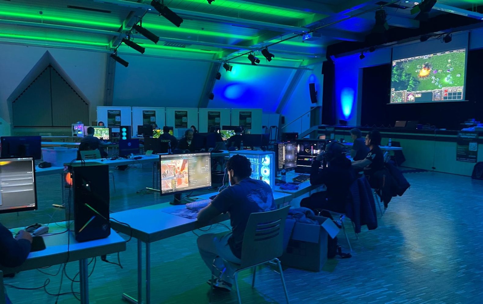 Teilnehmer vertieft im Spiel: Zahlreiche Gaming-Stationen füllen den Saal, während die Spieler konzentriert an ihren PCs sitzen.
