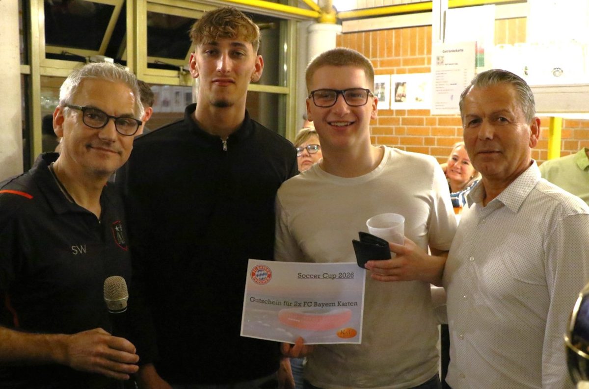 Im Casino der Hallberghalle überreichten Sponsor Josef Fischer und AH-Leiter Sven Waldmann die Preise und Pokale an die Mannschaften. Alle Teams erhielten – abhängig vom erreichten Platz – einen Wertgutschein des Sponsors K&F, während sich der Turniersieger zusätzlich über den begehrten Wanderpokal freuen durfte. Wie bereits im Vorjahr eingeführt, vergab der Sponsor auch heuer wieder einen Sonderpreis für den eindrucksvollsten Spieler sowie für den besten Torwart: Leon Würzinger und Roko Vukman wurden ausgezeichnet. Beide erhielten als besondere Anerkennung des K&F Soccer-Cups jeweils eine Eintrittskarte für ein Heimspiel des FC Bayern München. Die Junge Union hatte das zweifelhafte Vergnügen den „Goldene-Ananas-Pokal“ entgegennehmen zu dürfen, für 15. Platz des Turniers. Anschließend feierte das generationenübergreifende Partyvolk diesen Tag und sich selbst bei der schon legendären „After- Soccer-Party“.