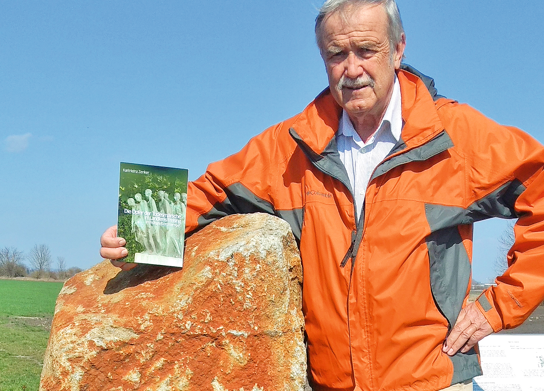 Der Gedenkstein mit Informationstafel am Ortsrand und Buch „Die Opfer der Todesmärsche“, herausgegeben von Karl-Heinz Zenker, erinnern an die Todesmärsche im Frühjahr/Sommer 1945.