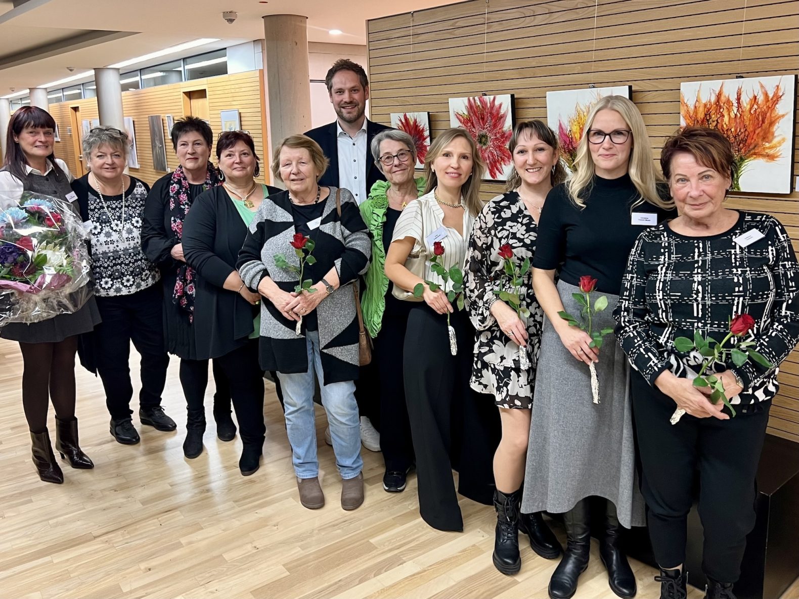 Ausstellende Künstlerinnen v.l.n.r.: Inez Eckenbach-Henning, Anneliese Adelsperger, Gabi Hofmann, Elke Trakies, Maria Mehrbrodt, Geri Hoffmann, Irina Krätschmer, Stephanie Frank, Christina Thenert-Moser, Stefanie Ihlefeldt. Begleitet von Bürgermeister Benjamin Henn.