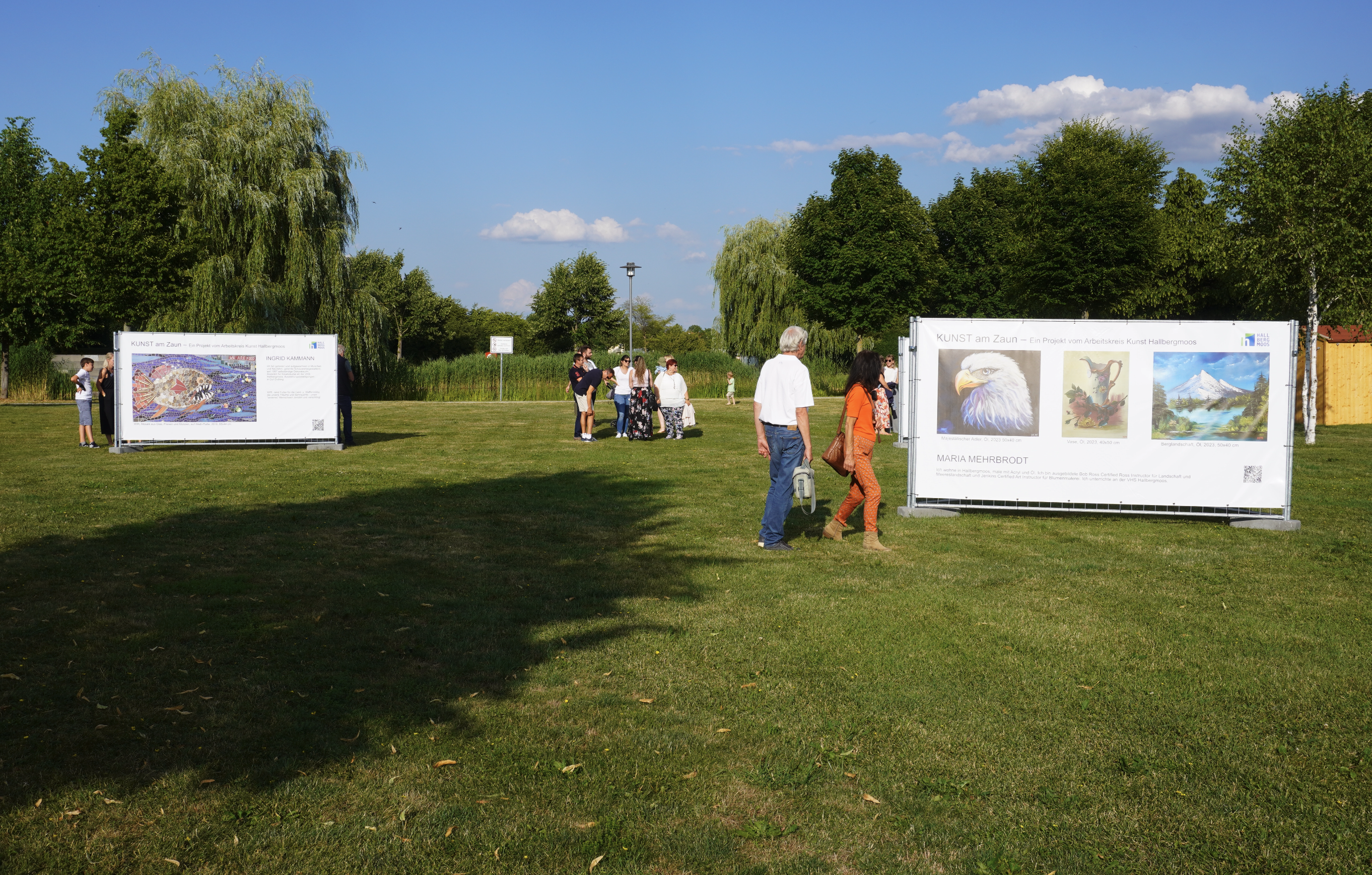 Für den AK Kunst aus Hallbergmoos zeigt das rege Interesse der Kreativschaffenden, wie wichtig Orte unterschiedlichster Art sind, Kunst einem breiten Publikum zeigen zu können. Denn es müssen längst keine vier Wände sein: „Es dürfen ungewöhnliche Orte sein, wie hier im Sport- und Freizeitpark, für den KUNST am Zaun auch eine Aufwertung bedeutet. Aktuell sind ja Kunstausstellungen zum Beispiel im Rathaus wegen des Umbaus auch gar nicht möglich“, sagt Eckenbach-Henning, die sich in ihren Arbeiten vor allem auf Landschaften in Aquarell fokussiert: „Wir haben hier eine gute Möglichkeit geschaffen haben, Kunst im öffentlichen Raum zu zeigen und freuen uns über die Unterstützung von Sportparkmanager Benjamin Henn, Veranstaltungsmanagerin Daniela Lindenmiller und des Gemeinderats, der das Budget bereit gestellt hat, ohne den das nicht möglich gewesen wäre.“ Selbst für das Aufstellen der Werke gibt es Hilfe aus der Gemeinde, betont Eckenbach-Henning dankbar: „Bauhofleiter Richard Wantscher und seine Mitarbeiter haben die Bauzäune angebracht und “Kunstbanner” montiert.“