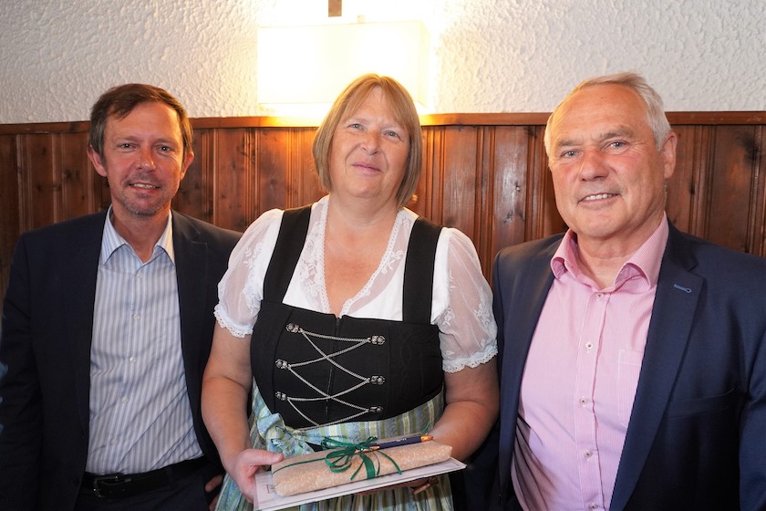 Nach dem Eintrag ins Goldene Buch der erfolgreichen Stockschützinnen zum Gruppenfoto: Roswitha Frühbeis, Josef Niedermeier (Bürgermeister), Angelika Neumair (Abteilungsleiterin Stockschützen)