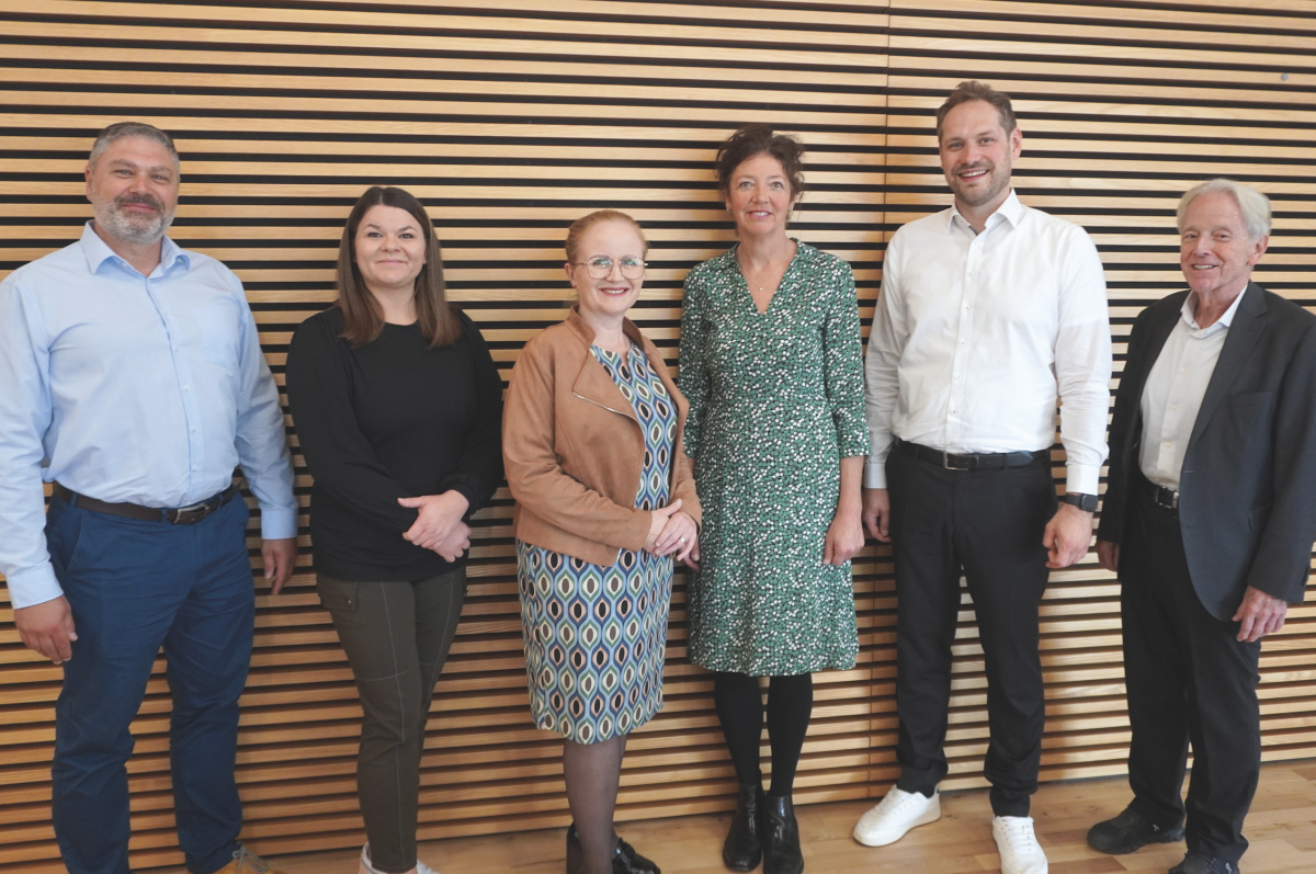 Nach vielen Gesprächen mit Ärzten freuen sich Bürgermeister Benjamin Henn (2.v.r.), Wirtschaftsförderer Alexander Mademann (1.v.l.), Gesundheitsreferentin Tanja Knieler (3.v.l.) über die neue Kinderarztpraxis mit Leonhard Ortscheret (1.v.r.), Eigentümer des Gebäudekomplexes und Dr. Beatrice Heineking (3.v.r.) und Sabrina Helfst, MFA (2.v.l.).