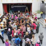 Kiwi, Melone, Mandarinen, Bananen, Gurke, Tomaten, Käsewürfel… – auf zwei langen Tischen stand viel bereit, was gesund ist und schmeckt, mundgerecht geschnippelt und appetitlich angerichtet. Das geht natürlich nicht ohne ehrenamtlichen Einsatz, 19 Mamas und ein Papa – die meisten passend in Halloween- Verkleidung – waren schon lange vor der großen Pause im Einsatz und hatten alles vorbereitet. Viele der Schülerinnen und Schüler wussten Bescheid und brachten ihre leere Brotzeit-Box mit, die an den Tischen nach Wunsch gefüllt wurde. Verteilt werden vor allem regionale Produkte und es dürfen nur Betriebe liefern, die dafür ausdrücklich zertifiziert sind. Für die Hallbergmooser Grundschule ist dies der Goldachmarkt, der die Kinder mit jeweils rund 50 Kilogramm Obst und Gemüse versorgt.