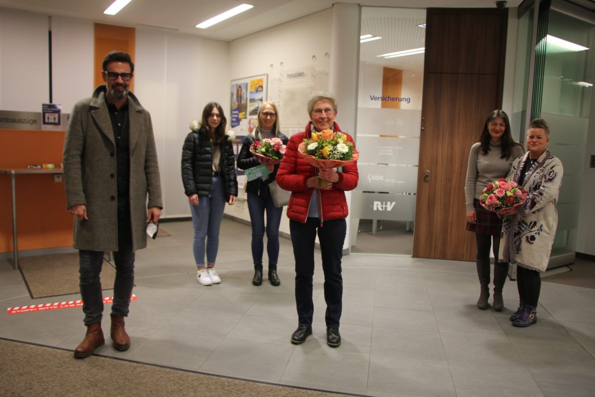 Übergabe der Hauptpreise aus der Weihnachtslosaktion 2020: (v. li) Heiko Schmidt, 1. Vorstand der Werbegemeinschaft, Michelle und Bettina Meurer (3. Preis) und Christel Koch (1. Preis). Blumen gab es auch für Petra Wimmer und Constanze Lehmann von der VR-Bank.