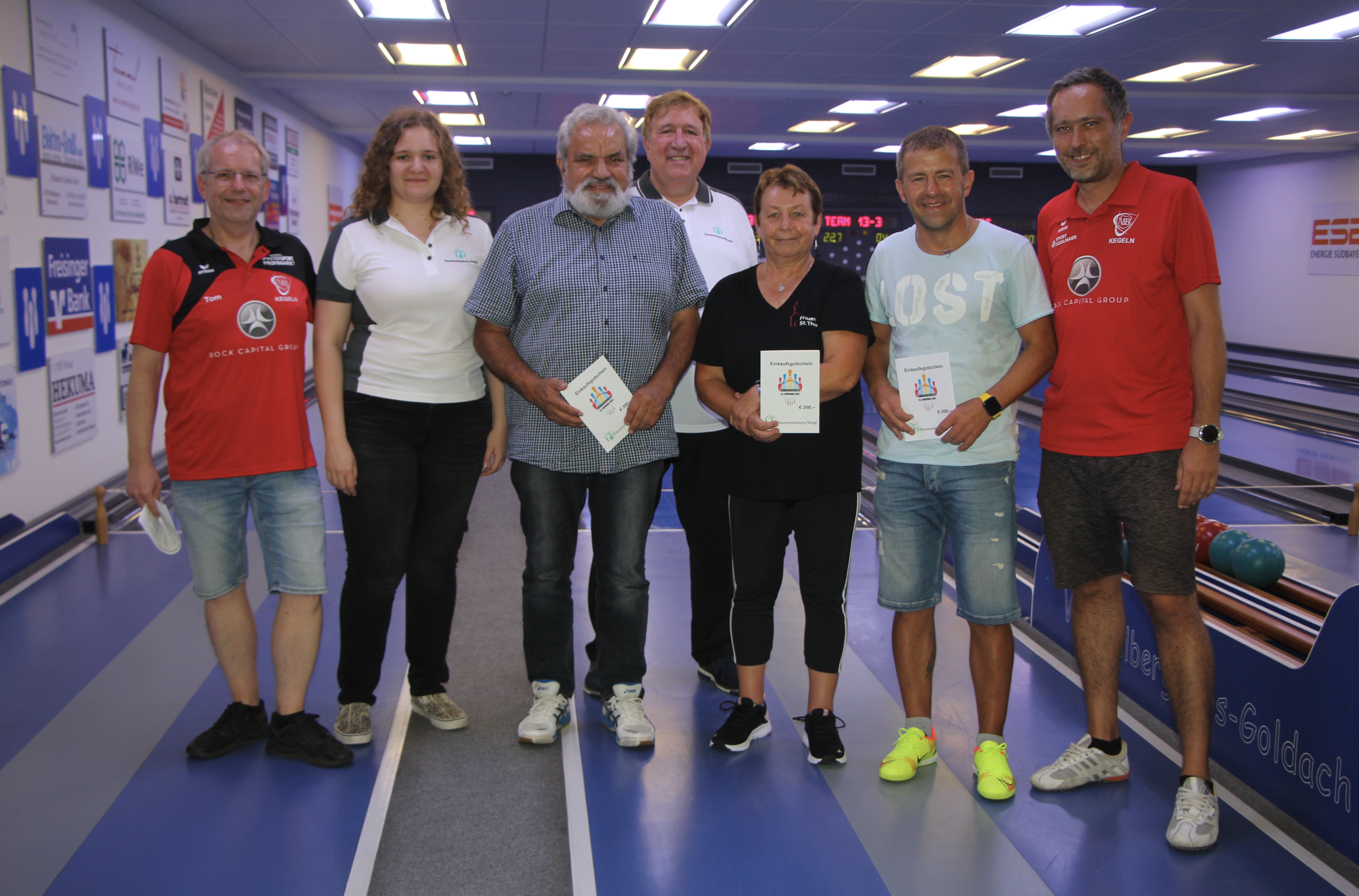 So sehen Sieger aus: (Mitte) Gerhard Abstreiter (1.), Margot Buchhauser (2.) und Rigo Brandt (3.). Mit ihnen freuen sich (v.li) Thomas Tetzlaff (Sportwart Kegeln), Vivienne und Manfred Zenz (Fa. Rampf) und Marcus Most (Abteilungsleiter Kegeln)