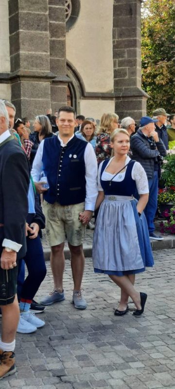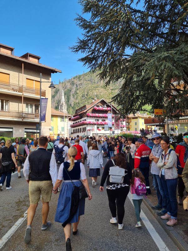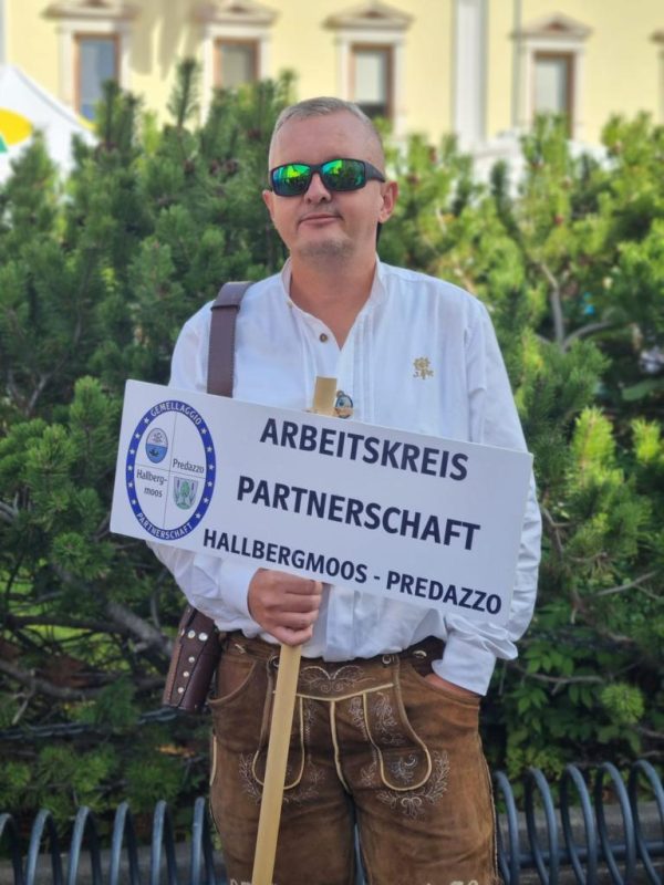 Am nächsten Morgen, nach dem Sonntagsgottesdienst mit Festumzug vom Almabtrieb, begrüßt Bürgermeisterin Maria Bosin die Besucher aus Hallbergmoos, bevor sie zum Mittagessen ins Festzelt bittet. Dort überbringt Partnerschaftsreferent Thomas Henning Grußworte aus Hallbergmoos und erinnert an das mit großer Freude erwartete Wiedersehen beim Hallbergmooser Volksfest und das anstehende Jubiläum zur 30-Jahre Partnerschaft im Oktober 2024. Was ganz klein beginnt … Die Partnerschaft zwischen beiden Gemeinden wächst bereits seit 1979, zunächst ganz privat und rein freundschaftlich zwischen Georg Förg aus Hallbergmoos und Hubert Sanin aus Predazzo. Die offizielle Partnerschaft initiiert letztlich Predazzos ehemaliger Bürgermeister, Franco Dellagiacomo. Im April 1994 unterschreibt Dellagiacomo in Hallbergmoos den in italienischer Sprache verfassten Partnerschaftsvertrag gemeinsam mit dem damaligen Bürgermeister von Hallbergmoos Manfred Pointner. Im September 1994 kommt es zum Gegenbesuch. Dabei leisten beide ihre Unterschrift auf den in deutscher Sprache verfassten Partnerschaftsvertrag in Predazzo.