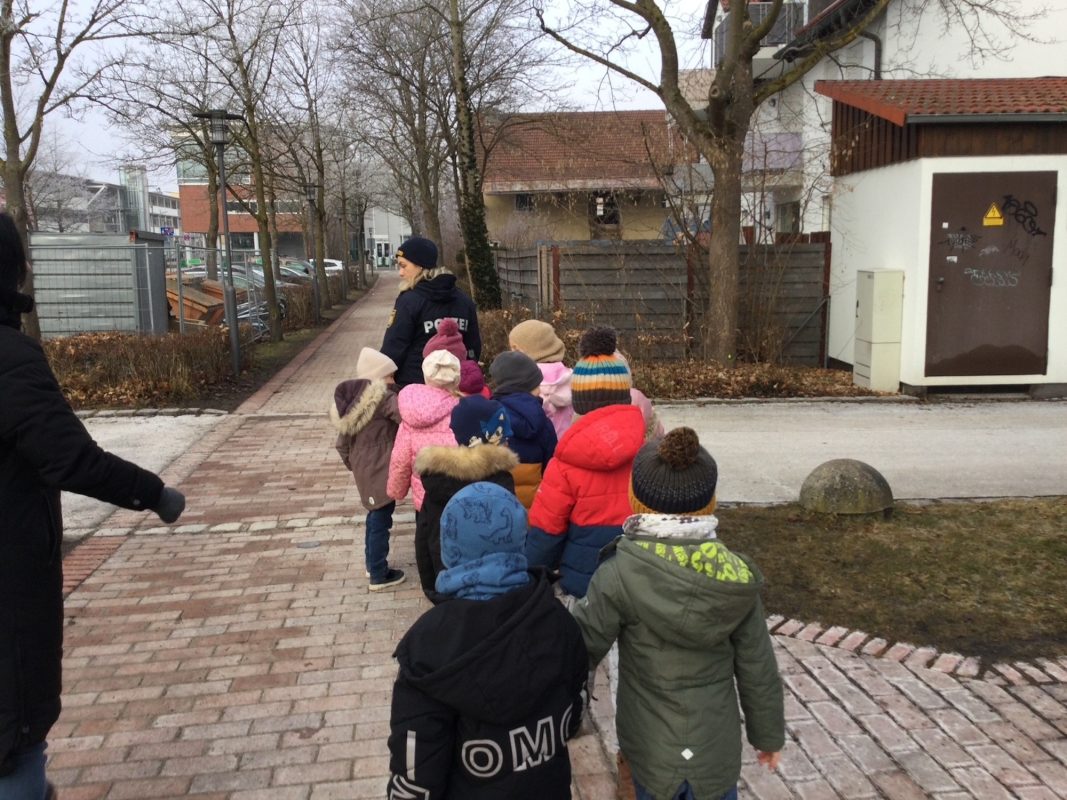 Kürzlich besuchte Frau Fersch von der Polizei Neufahrn die zukünftigen Schulanfänger des AWOKindergarten Sonnenschein, um gemeinsam mit ihnen das richtige Verhalten im Straßenverkehr zu üben. Zu Beginn durften die Kinder erste spielerische Übungen in der Turnhalle durchführen. Mit Hilfe der dort aufgebauten Ampelanlage, sowie eines Zebrastreifen, lernten die Kinder, worauf sie beim Überqueren einer Straße achten müssen. Anschließend ging es nach draußen an die „echte“ Straße am Rathaus. Dort konnten die Kinder das Gelernte gleich praktisch anwenden und das sichere Überqueren der Straße üben. Die Polizistin erklärte dabei alles kindgerecht und beantwortete die vielen Fragen der Kinder. Der Besuch war für die Kinder sehr spannend und lehrreich und trug dazu bei, mehr Sicherheit im Straßenverkehr zu vermitteln. Herzlichen Dank Frau Fersch von der Polizei Neufahrn, die sich auch in dieses Jahr wieder, Zeit für uns genommen hat.