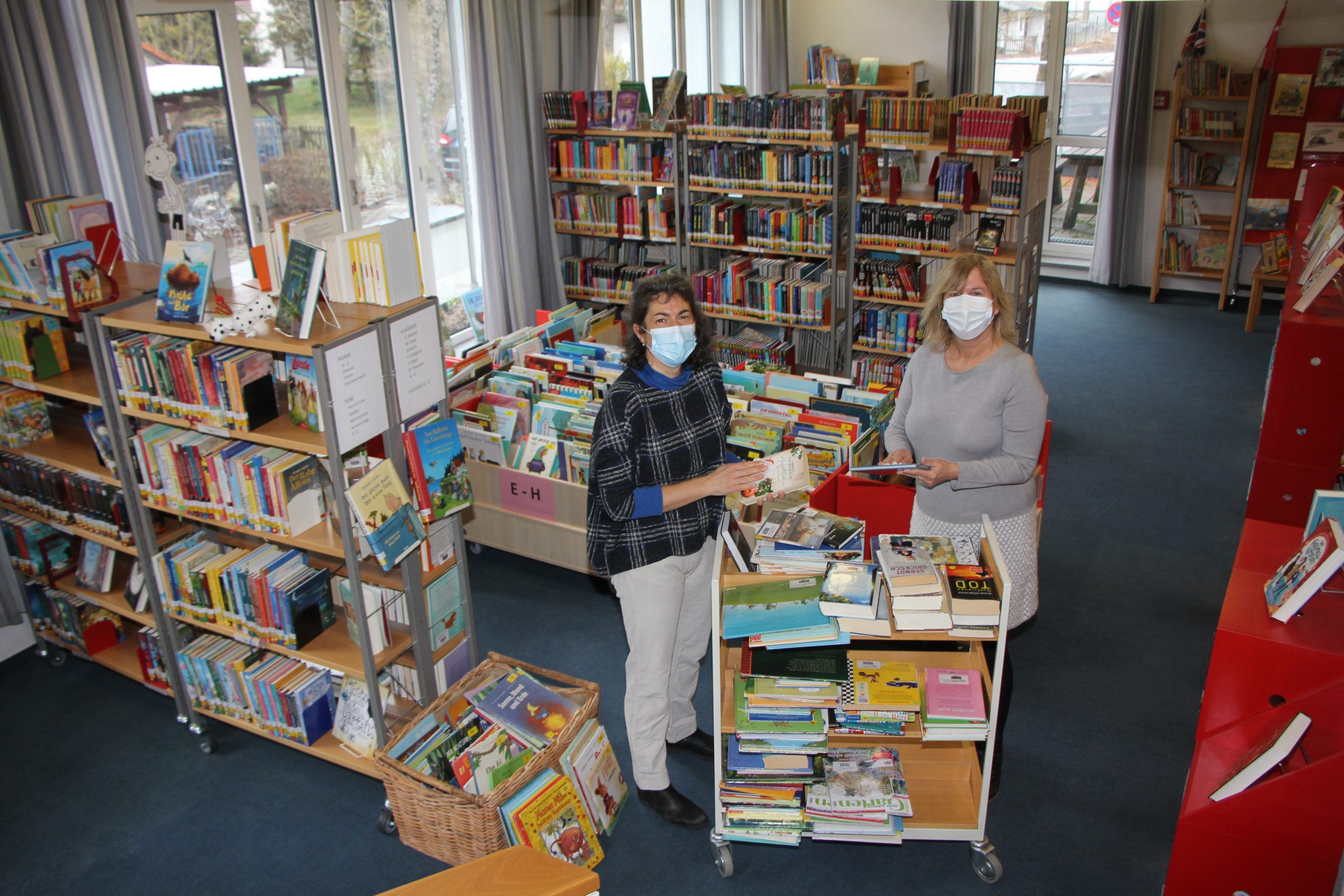 Hygieneregeln gelten auch für Bücher. Dafür sorgen u.a. Valerie Stromberger (li.) und Leiterin Petra Niedermair (re).