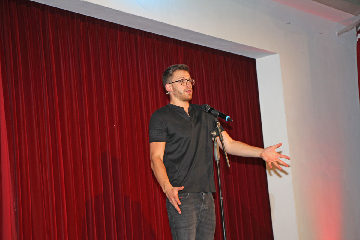 Wie möchte man als Künstler begrüßt werden? Mit frenetischem Applaus und lautem Trampeln! Also nochmal alles auf Anfang und dann klappt es: beim zweiten Anlauf wird Martin Frank, der Kabarettist aus Niederbayern, im voll besetzten Gemeindesaal lautstark mit begeistertem Beifall empfangen. Ein gekonntes Warm-up!