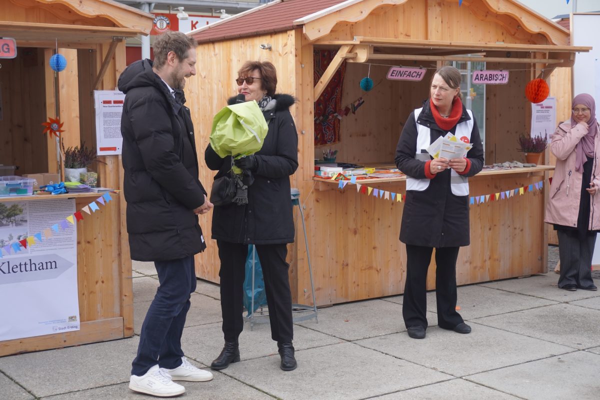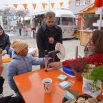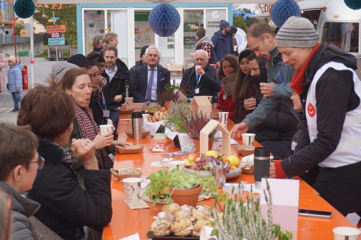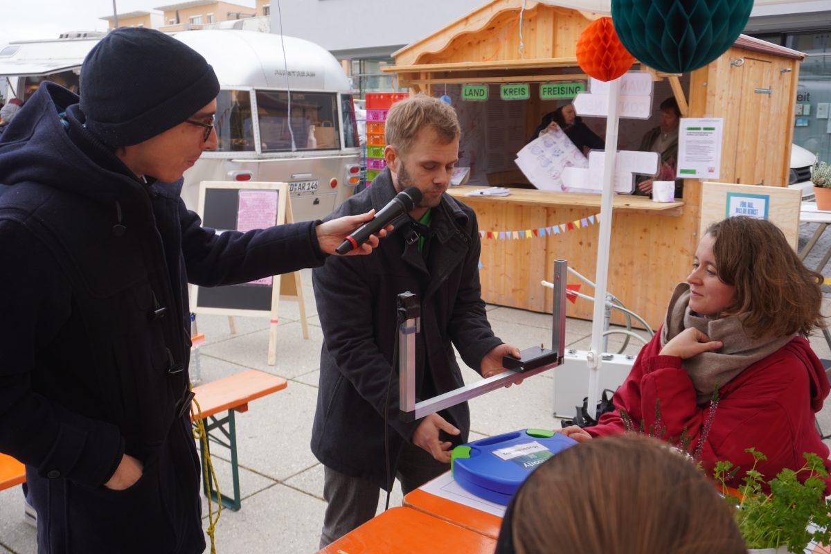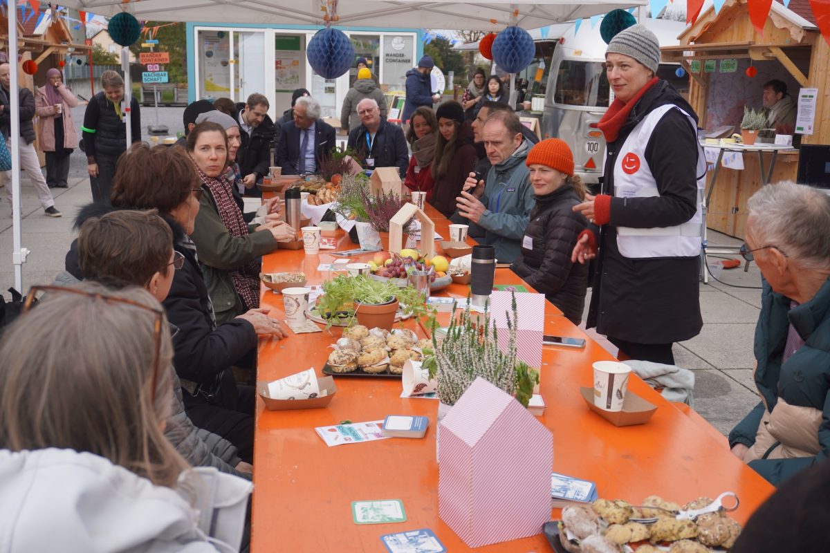 Es ist kalt, dazu sorgen gelegentliche Böen für ordentlich Wirbel auf dem Rathausplatz. Dennoch trotzen neben ein zum Info-Büro umfunktionierter Wandercontainer und eine 20 Quadratmeter große Landkarte der Region, einige Marktstände mit Vertretern unterschiedlicher Gruppen wie dem Dekanat Freising, Neue Quartiermitte Klettham (Stadt Erding), TUM Future Work Living Lab x IBA, curiocity – das Science Center und dem Hospizkreis Freising den ungemütlichen Bedingungen. Weitere Teilnehmer und Interessenten sitzen unter einem Pavillon, frühstücken und tauschen sich aus: „Begegnungsstätten zu schaffen, um zusammenzukommen, das ist ja auch immer mein Anliegen“, meint Rathauschef Henn: „Sie machen dieses schwierige Thema ein wenig greif- und nahbarer und hier in Hallbergmoos ist eben der Anstoß dafür weiterzumachen.“ Mittendrin steht auch Christa Stewens, die Vorsitzende des Nachbarschaftsbeirats und beteiligt sich rege an den Gesprächen.