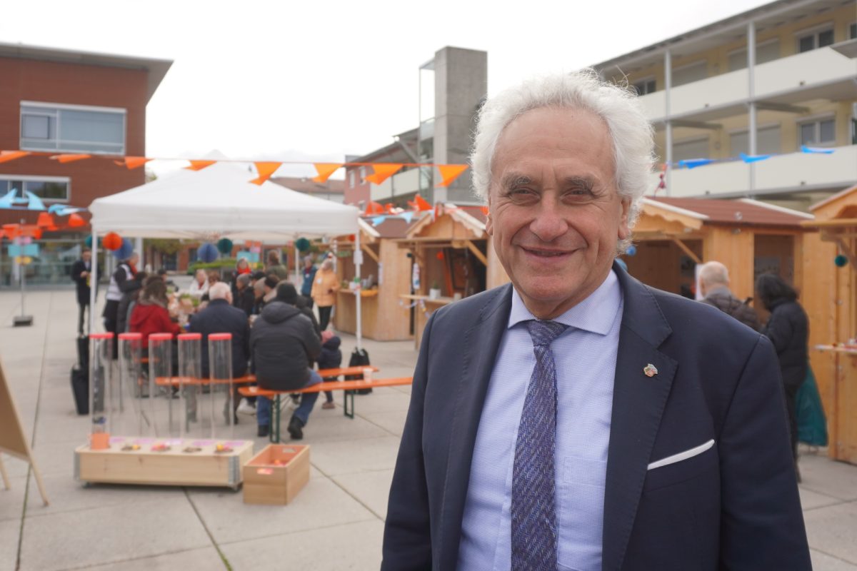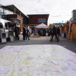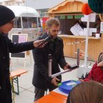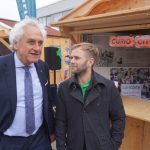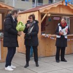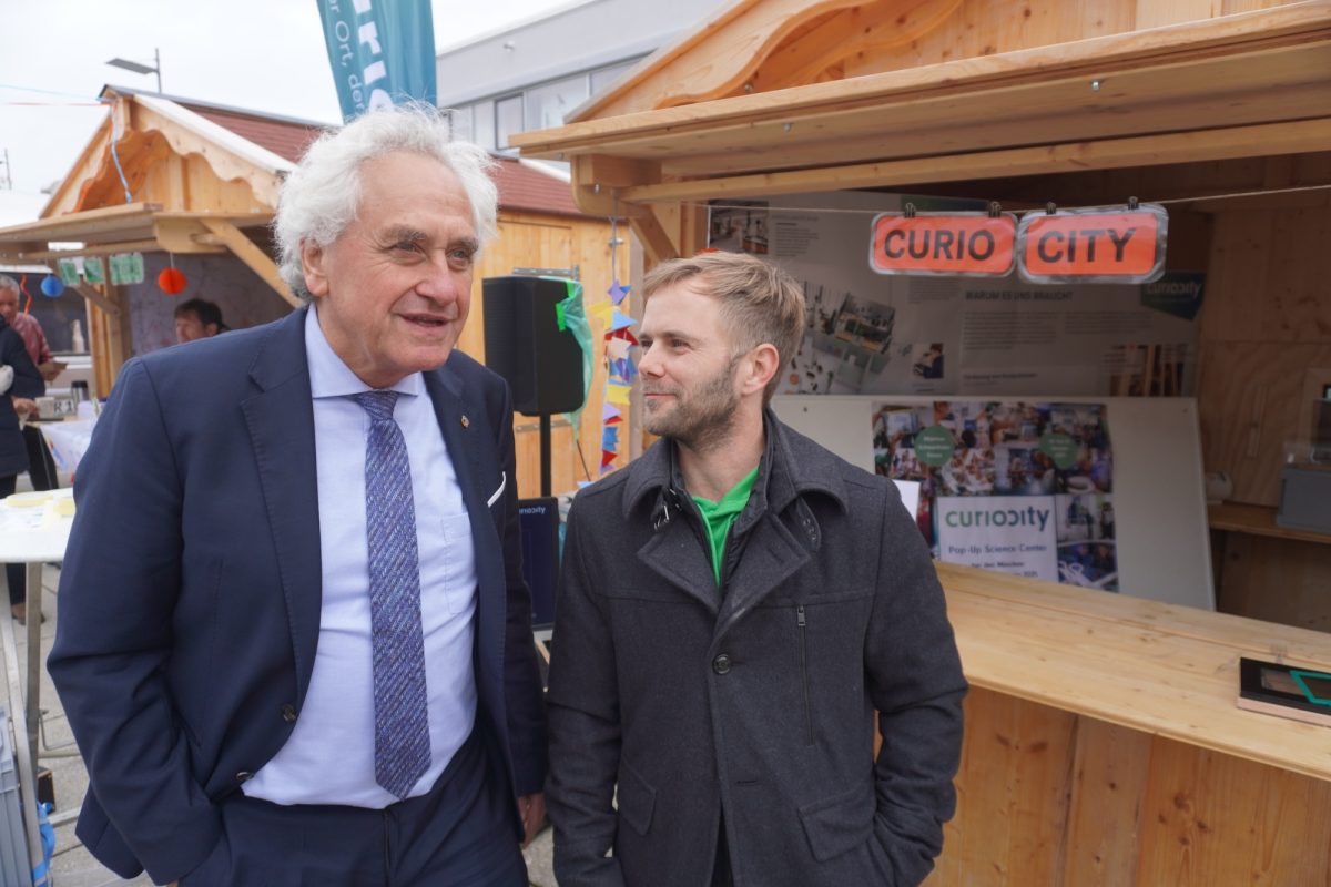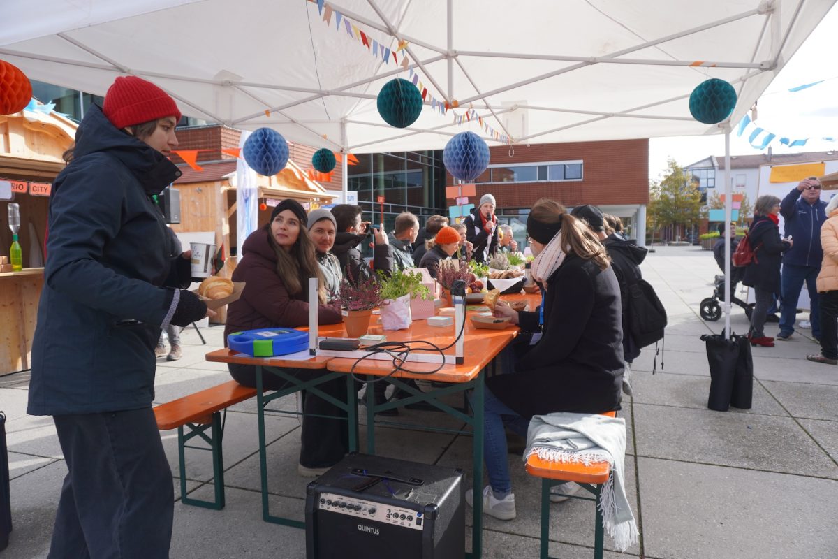 Es ist kalt, dazu sorgen gelegentliche Böen für ordentlich Wirbel auf dem Rathausplatz. Dennoch trotzen neben ein zum Info-Büro umfunktionierter Wandercontainer und eine 20 Quadratmeter große Landkarte der Region, einige Marktstände mit Vertretern unterschiedlicher Gruppen wie dem Dekanat Freising, Neue Quartiermitte Klettham (Stadt Erding), TUM Future Work Living Lab x IBA, curiocity – das Science Center und dem Hospizkreis Freising den ungemütlichen Bedingungen. Weitere Teilnehmer und Interessenten sitzen unter einem Pavillon, frühstücken und tauschen sich aus: „Begegnungsstätten zu schaffen, um zusammenzukommen, das ist ja auch immer mein Anliegen“, meint Rathauschef Henn: „Sie machen dieses schwierige Thema ein wenig greif- und nahbarer und hier in Hallbergmoos ist eben der Anstoß dafür weiterzumachen.“ Mittendrin steht auch Christa Stewens, die Vorsitzende des Nachbarschaftsbeirats und beteiligt sich rege an den Gesprächen.