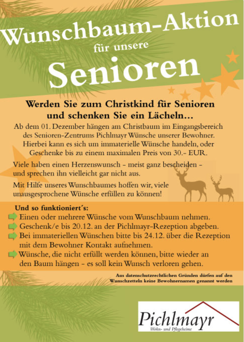 Seit dem 01. Dezember hängen an den Christbäumen im Eingangsbereich der Pichlmayr Senioren-Zentren Wunschzettel der Bewohner. Hierbei kann es sich um immaterielle Wünsche handeln, oder Geschenke bis zu einem maximalen Preis von 30,- EUR. Viele haben einen Herzenswunsch – meist ganz bescheiden – und sprechen ihn vielleicht gar nicht aus. Mit Hilfe des Wunschbaumes hoffen alle, viele unausgesprochene Wünsche erfüllen zu können!
