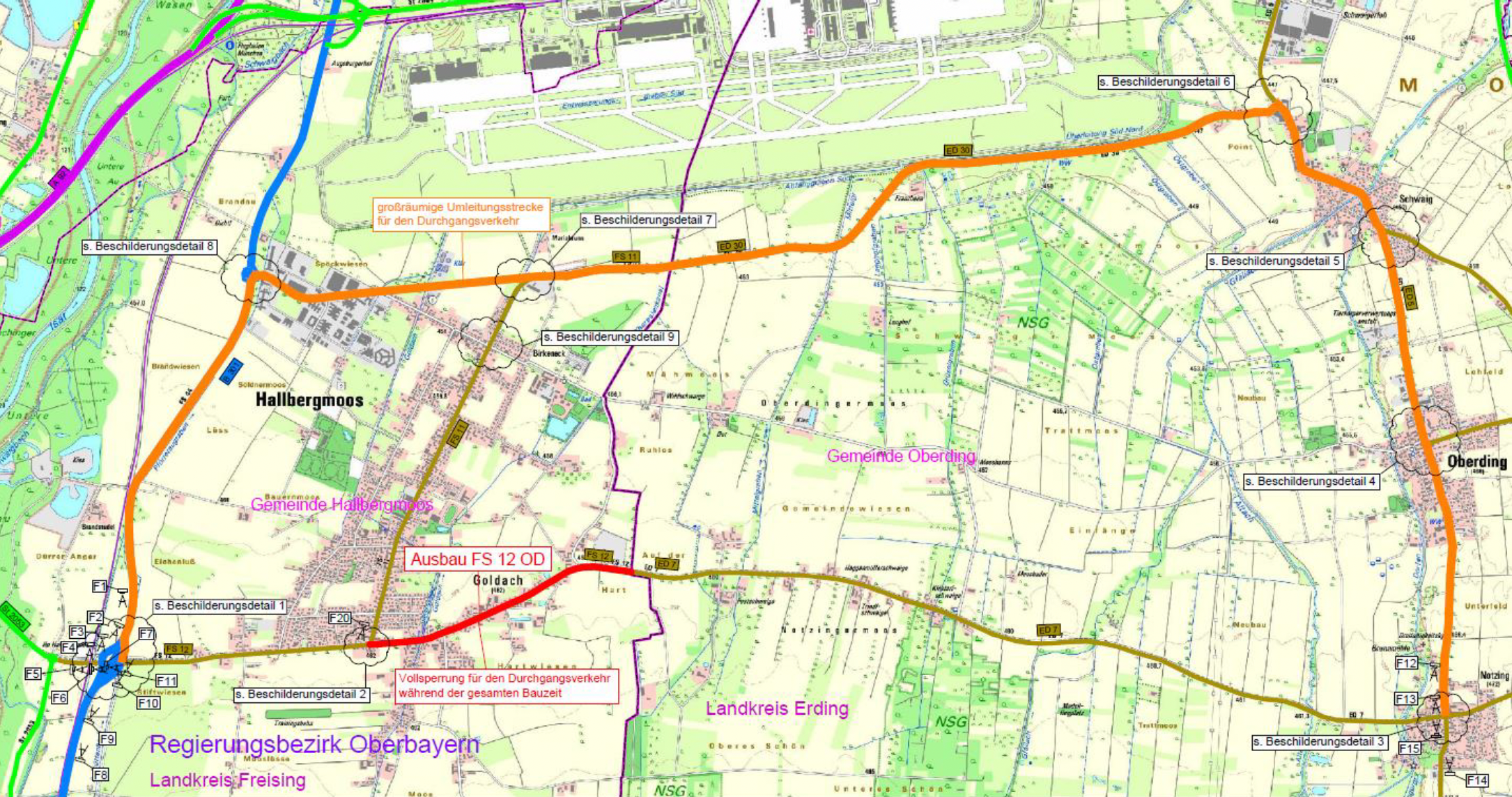 Der Verkehr aus Osten kommend wird ab der Kreuzung Erdingermoos Str./Römerstraße (ED5/ED7) in Notzing über die Kreisstraße ED 5 nach Oberding und Schwaig weiter über die Kreisstraßen ED 30/FS 11 nach Hallbergmoos geleitet. Der überörtliche Verkehr soll in Hallbergmoos der offiziellen Umleitungsbeschilderung über die Nordumfahrung und die B301 folgen.