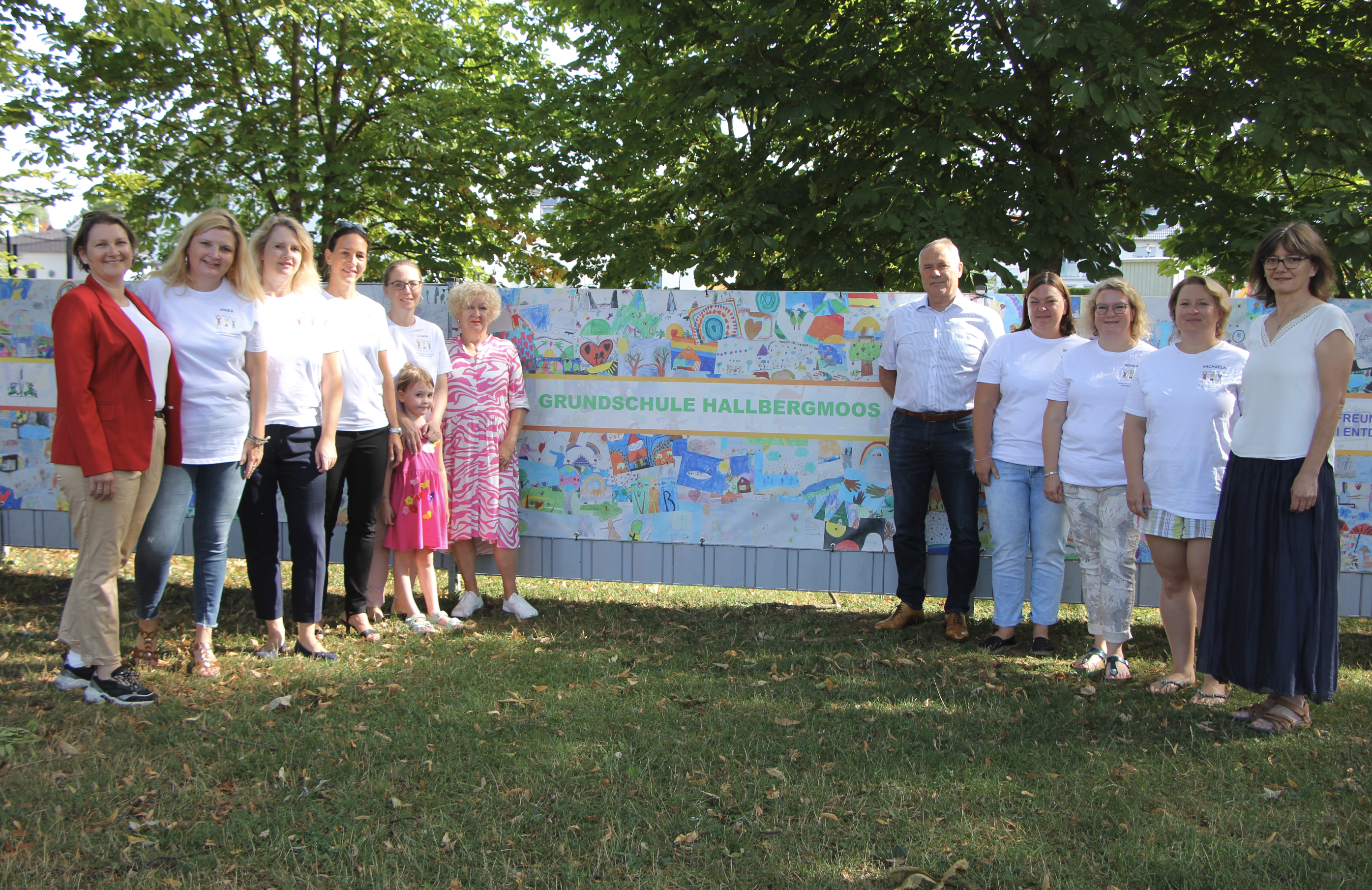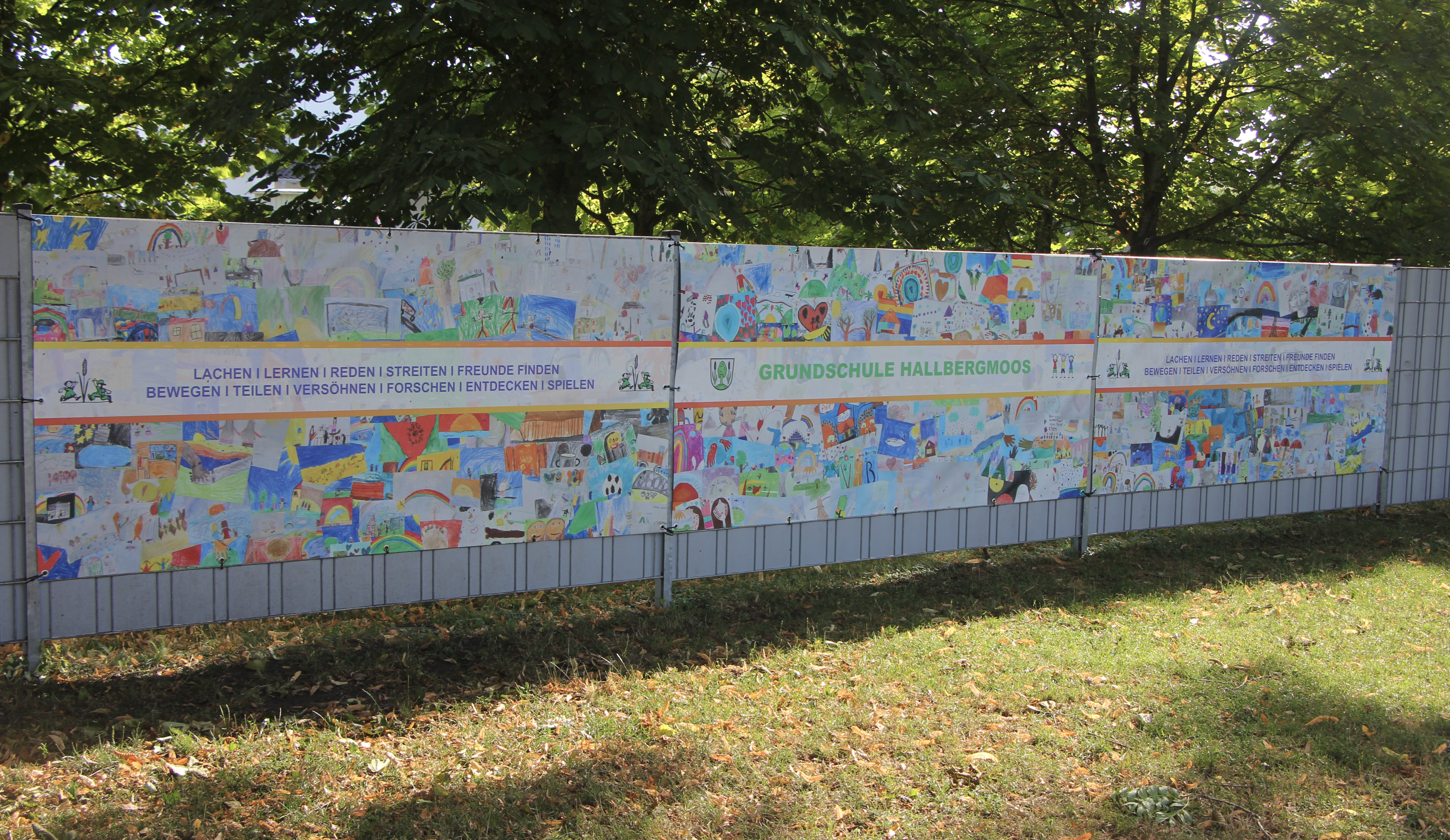 Vorgestellt wurden die Banner mit den Bildern der Grundschülerinnen und Grundschüler bereits beim Schulfest im Mai, aber leider regnete es an diesem Nachmittag in Strömen, so dass die drei Bildwände auf besseres Wetter warten mussten, um an die Grundschule Hallbergmoos überreicht zu werden. Mitte Juli war es dann so weit, die Banner waren inzwischen am Zaun montiert und wurden ganz offiziell an die Grundschule übergeben.