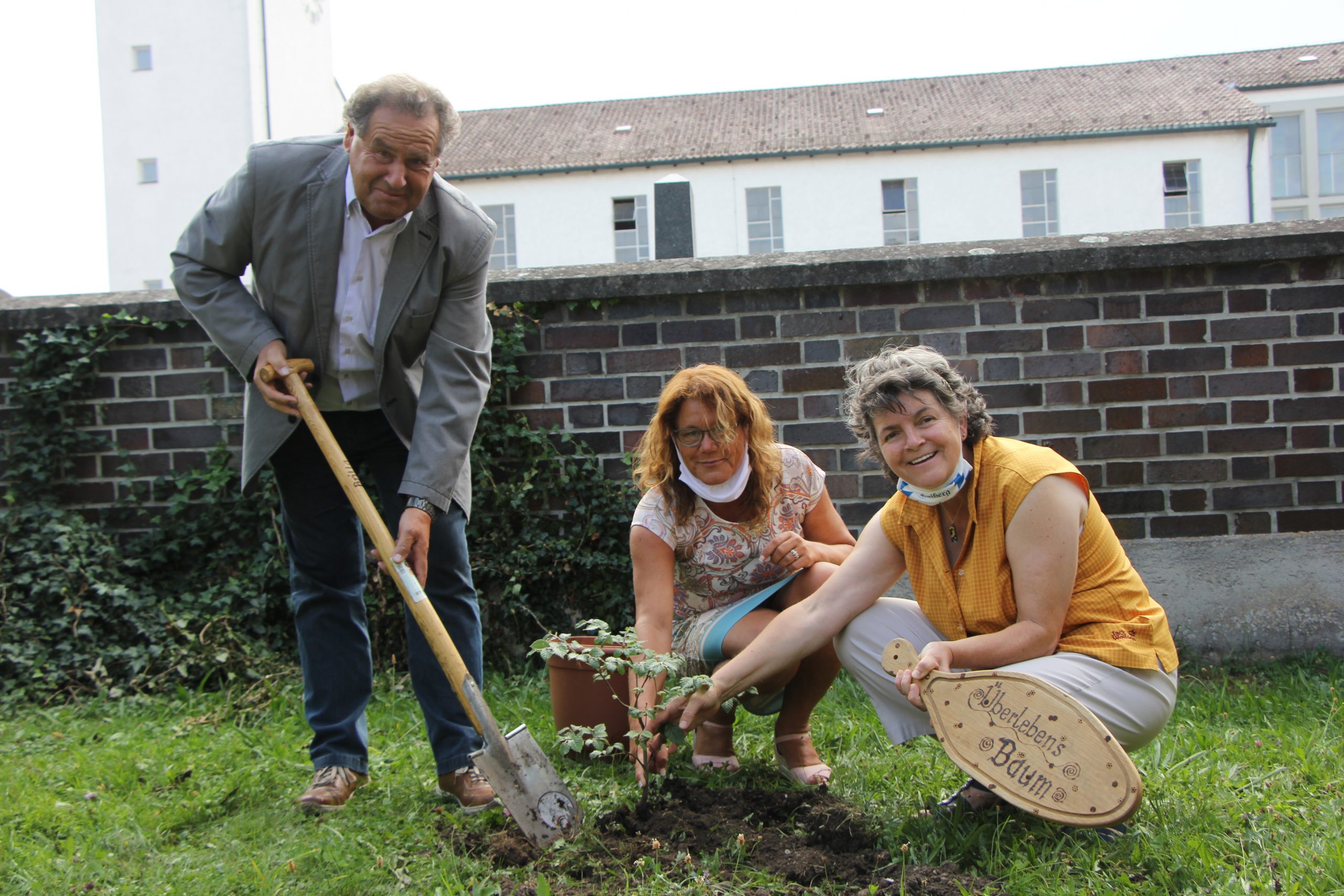 Gemeinsam geht’s besser: Der „Überlebensbaum“ wird eingepflanzt vom 2. Bürgermeister Helmut Eckert, Tanja Voges (Tafel) und Martina Wilkowski (NBH)