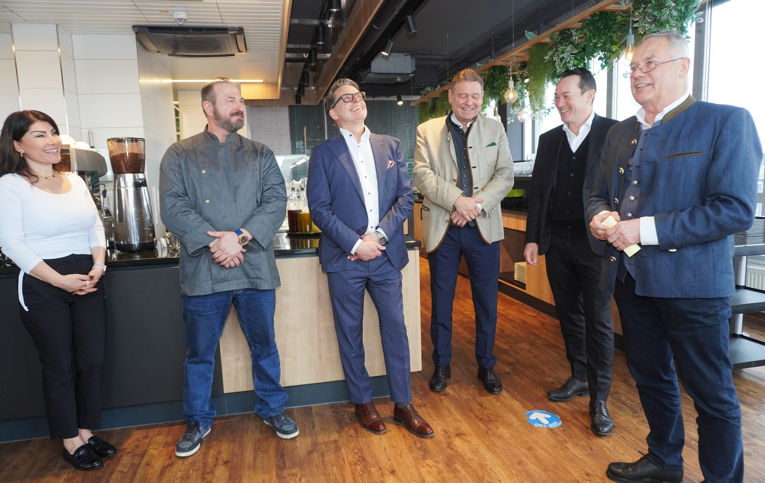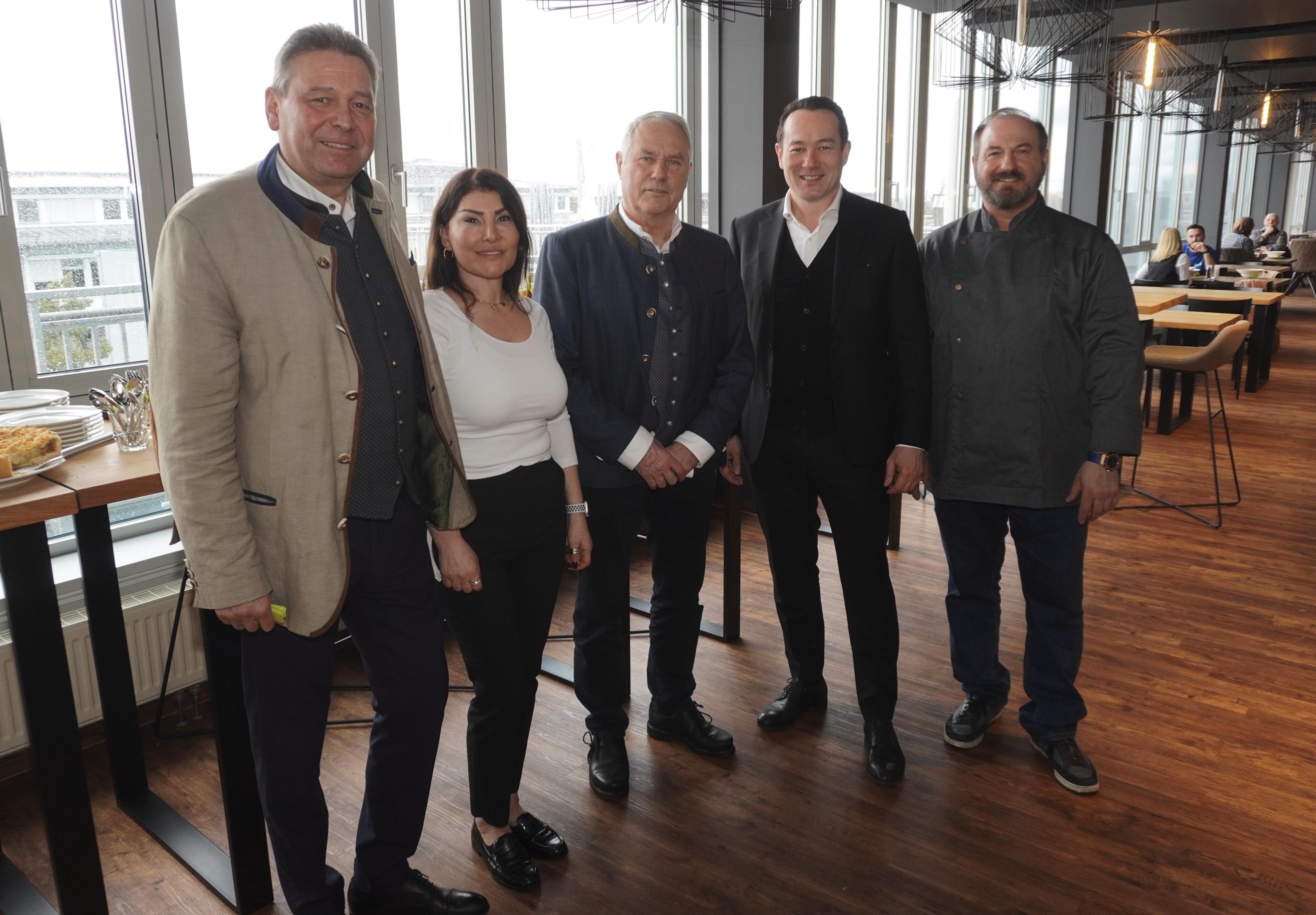 Künftig Rooftop-Schlemmen im Skygate: Bernhard Link (Mitgesellschafter), Sevim Gül (Geschäftsführerin), Josef Niedermair (Bürgermeister), Christian Lealahabumrung (gesellschafter Rock Capital) und Küchenmeister und geschäftsführer Josef Ratzenberger.