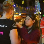 Zeit, um kurz durchzuatmen und selbst ein kleines Gläschen zu genießen, bevor die Party eskaliert! „Nachdem ich zum Vorstand gewählt wurde, war mir zwei Tage später bewusst, dass ich jetzt verantwortlich bin und da war ich schon ein bisserl panisch“, gibt Verena, die Soziale Arbeit studiert, mit entwaffnender Offenheit zu. „Aber Ramona ist einfach eine total gute Unterstützung, ohne sie würde es nicht so gut laufen. Überhaut alle Mädels machen das alles so gut.“ Ramona, genauso fröhlich, pflichtet ihr bei und schwärmt: „Unsere Mädels sind wirklich sensationell. Jede hat doppelte Schichten ohne Murren eingelegt.“ Nach der „Ära Linh“ sprechen beide von der riesigen Herausforderung die Fußstapfen ausfüllen zu können. „Den größten Respekt hatten wir davor den Überblick zu behalten“ so Architekturstudentin Ramona: „Linh hat wirklich jedes Detail im Kopf, während wir bei jedem Punkt überlegen mussten, ob wir es überhaupt brauchen oder ob und gegebenenfalls, von wem es organisiert wird.“ Das Duo ist dankbar sich mit allen Fragen an das lang bewährte Team Linh Ha, Giulia Hiergstetter und Gabriela Saronja wenden zu können, betont Verena: „Wir haben auf jeden Fall gelernt: Unbedingt immer eine Genehmigung einholen, denn ohne sie geht gar nichts.“ Als habe Linh alles gehört, steht sie plötzlich bei ihren Nachfolgerinnen mit den Funksprechern und hilft den beiden sie fachgerecht anzulegen. „Die beiden werden in die Aufgabe hineinwachsen und ihren Weg gehen“, lobt Linh die Neulinge.