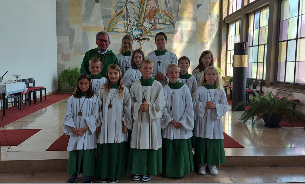 Neun Erstkommunionkinder haben sich in diesem Jahr für den Ministrantendienst begeistern lassen. In drei Treffen konnten sie erfahren und praktisch erproben, welche Aufgaben damit verbunden sind. Dabei wurden die neuen „Minis“ angeleitet von den Chefministranten Fabian Dirscherl und Eva Obermeier. Bei der offiziellen Einführungsfeier in der Herz-Jesu-Kirche Goldach beim Sonntagsgottesdienst am 21.Juli konnten sie das Erlernte schon unter Beweis stellen.
