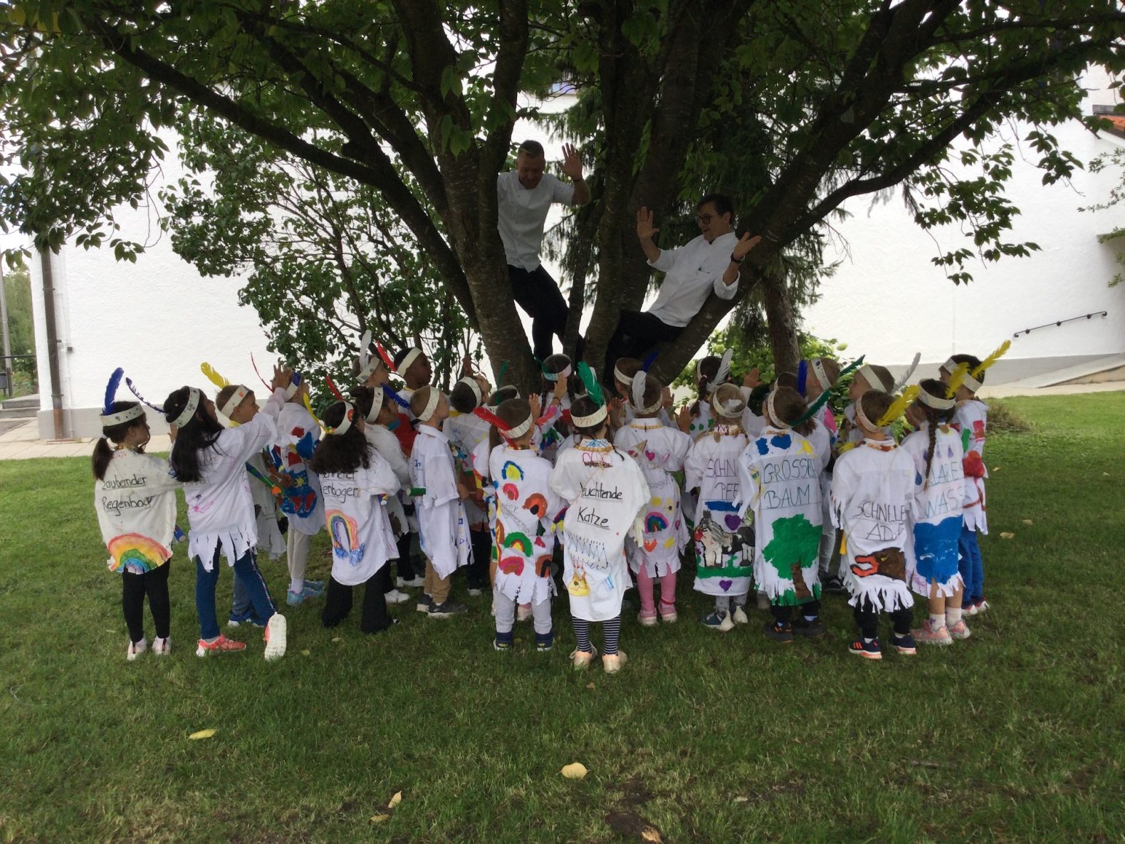 Zurück im „Steinhaus“ – dem Kindergarten – wartete bereits das große Tipi. Am Lagerfeuer lauschten die Kinder Geschichten, sangen Lieder und stärkten sich mit der traditionellen „Büffelsuppe“. Nur ein Versuch, noch einen „Büffel“ zu jagen, blieb leider erfolglos – das Tier war einfach zu schnell.