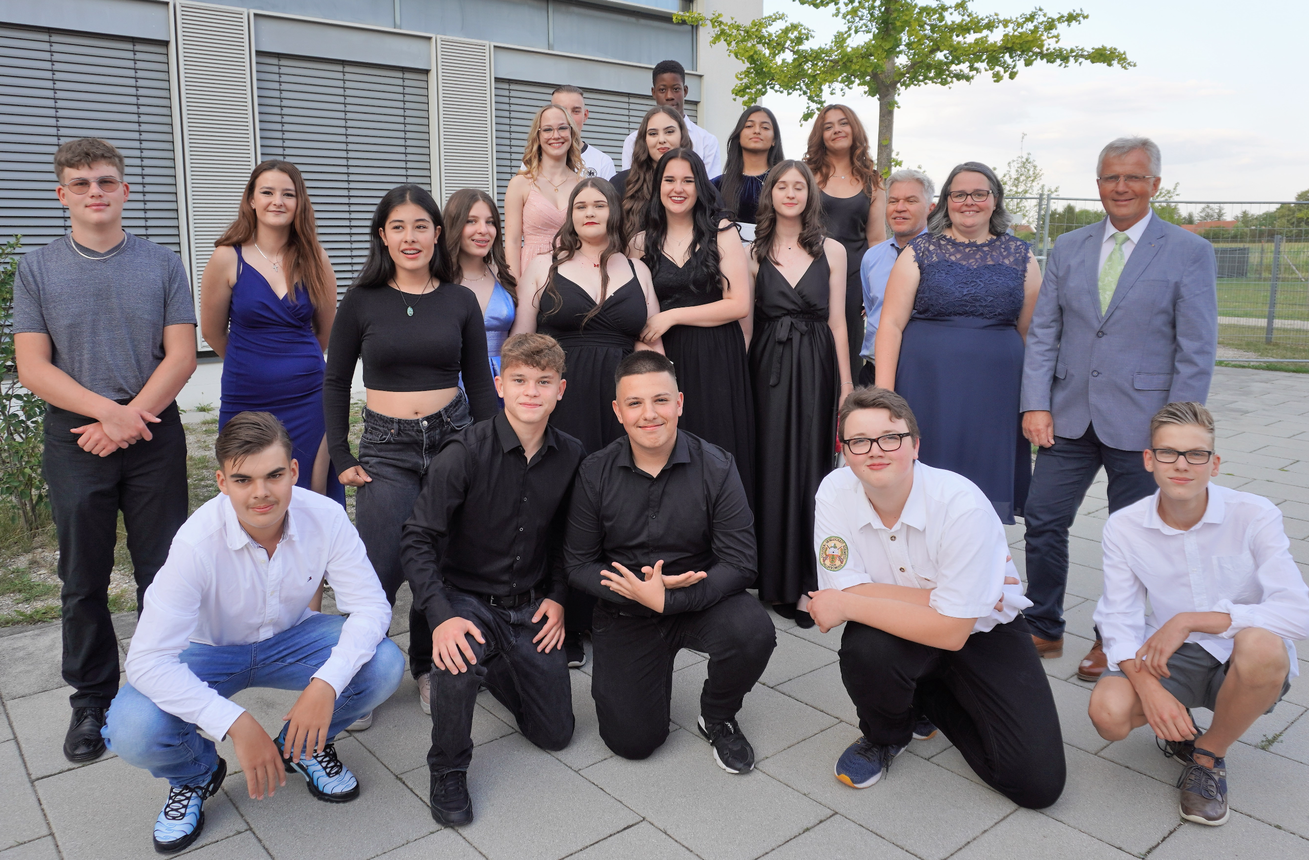 Weichs richtet seine Worte an die 27 Schulabgänger, die Klassenleiter Karl Landgraf (9b) als „spezielle Klassen“ beschreibt, „die von den Lehrkräften viel innere Ruhe, Geduld, Flexibilität, Augenmaß, Ausdauer, pädagogisches Feingefühl, Führungskompetenz, Fachwissen, Humor und Idealismus abverlangten.“ Landgraf würdigt die Kompetenz seiner Kollegin Anna Köppl (9a), die „noch etwas anderes in die Waagschale werfen konnte, um das Schuljahr zu überleben. Ohne ihr fränkisches Lebensgefühl und die pragmatische Art, wäre die Mission nicht gelungen.“ Die Gründe für die besondere Herausforderung erklärt Landgraf mit der Teilung der ehemaligen achten Klasse: “Dazu kamen die Coronajahre, es sind einige neu dazugekommen, sei es durch Zuzug oder weil sie wiederholt haben und der Klassenlehrerwechsel.“ Trotz aller Widrigkeiten haben jetzt 19 der Heranwachsenden ihren „Quali“ in der Tasche: „Anfangs dachte ich, dass es ein Drama wird. Mich wundert es, aber letztendlich ist alles normal. Die Besteherquote ist im Schnitt und eigentlich besser, als wir es erwartet hätten“, freut sich Landgraf. „Zwei bis drei Schüler machen bei uns weiter, eine wechselt auf die Wirtschaftsschule, eine weitere auf eine Privatschule, zwei oder drei wollen den Quali wiederholen und die anderen beginnen eine Ausbildung. “ Zu den Leistungen der Schulabgänger gratuliert Helmut Eckert (zweiter Bürgermeister) und wünscht ihnen vor allem Freude und Spaß für den weiteren Werdegang.