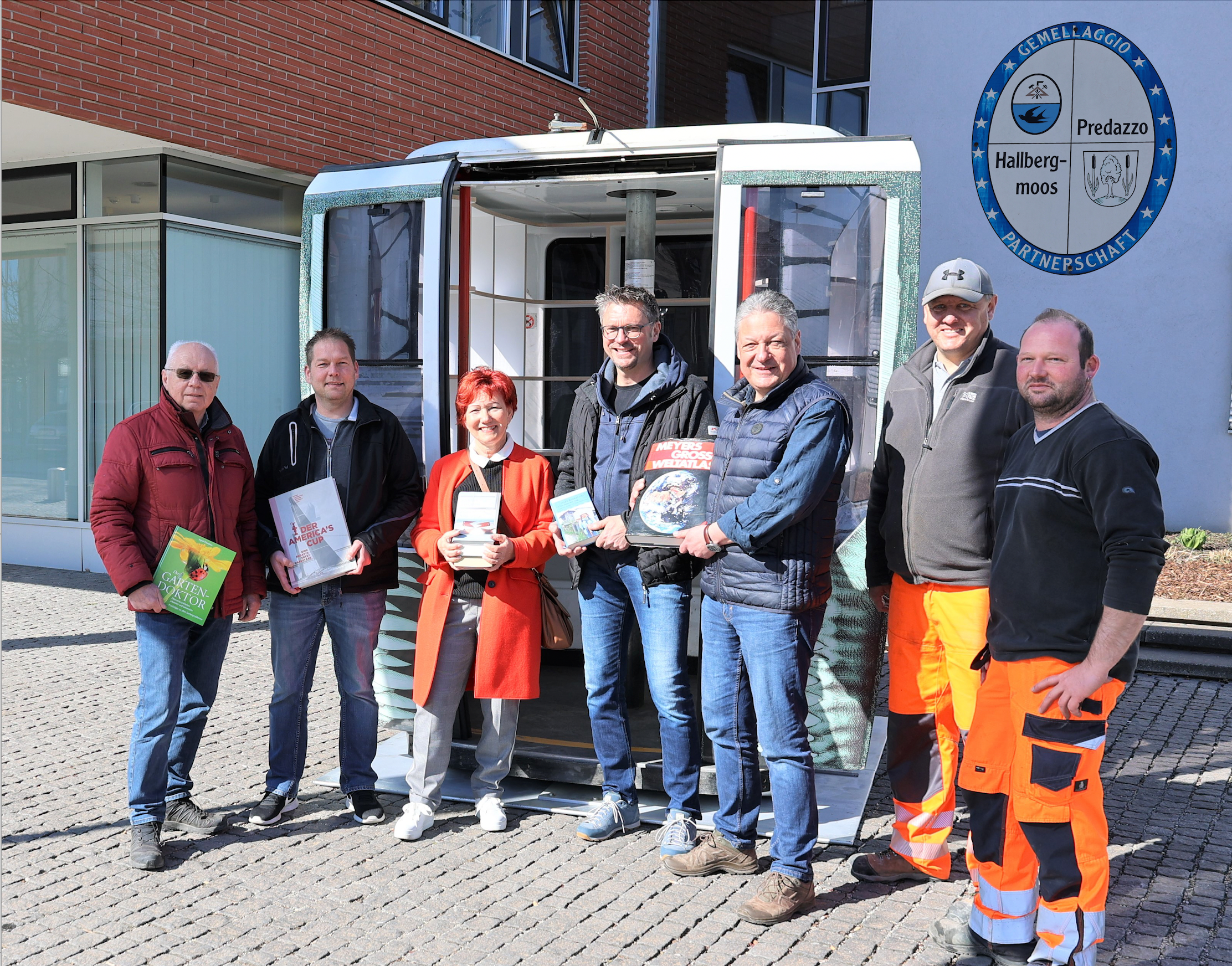 Aufstellung der Gondel vor dem Hallbergmooser Rathaus (v.l.n.r.): Georg Förg (AK Predazzo), Max Förg (Leiter AK Predazzo), Beate Bodenschatz (Leiterin Offener Bücherschrank), Robert Riedel (Schreinerei Riedel), Thomas Henning (Partnerschaftsreferent), Markus Lowa und Thomas Frank vom Bauhof