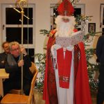 Nach eineinhalb Stunden war alles versteigert. Die Pause, die der Nikolaus zum Verschnaufen und zum Umziehen brauchte, überbrückten Anton und Christine Dobmaier mit einer heiteren Geschichte über ein Ehepaar, das darüber sinnierte, was man dem Sohn zu Weihnachten schenken sollte. Die beiden schwankten zwischen Zipfelmütze (Vater) und Maschinengewehr (Mutter) und sorgten damit für lautes Lachen beim Publikum. St. Nikolaus trat ein, in festliches Rot gekleidet, mit Mitra und Bischofsstab, den er sogleich seinem Berufskollegen Pfarrer Gruber zum Halten übergab. Er hatte sein silbernes Buch dabei, aus dem er das eine oder andere (mehr oder manchmal auch weniger) heitere Ereignis des vergangenen Jahres vortrug. Insgesamt hatte St. Nikolaus jedoch viel zu loben: die eifrige Jugend, den perfekten Grillmeister, den besonders fleißigen jungen Feuerwehrler, die Unterstützung der Damen für ihre Männer. Vor allem aber lobte der heilige Mann die gesamte Mannschaft für Einsatz, Zusammenhalt und Kameradschaft getreu dem Motto: „Kein Weg zu weit, kein Job zu schwer!“ Ein bisschen Wehmut kam am Schluss allerdings sogar bei St. Nikolaus auf, als er feststellte, „das ist unsere letzte Christbaumversteigerung in diesem Haus.“ Ein Programmpunkt stand noch aus, nämlich die Gipfelversteigerung. Zum Glück wurde die Spitze des wunderschönen Baums an diesem Abend nicht abgeschnitten, sondern kam nur symbolisch unter den Hammer, was vor allem der Spendenkasse diente. Danach begann der gemütliche Teil des Abends, dessen Dauer der Grichtmair Sepp augenzwinkernd so einschätzte: „A bisserl bleim ma scho no hocka!“