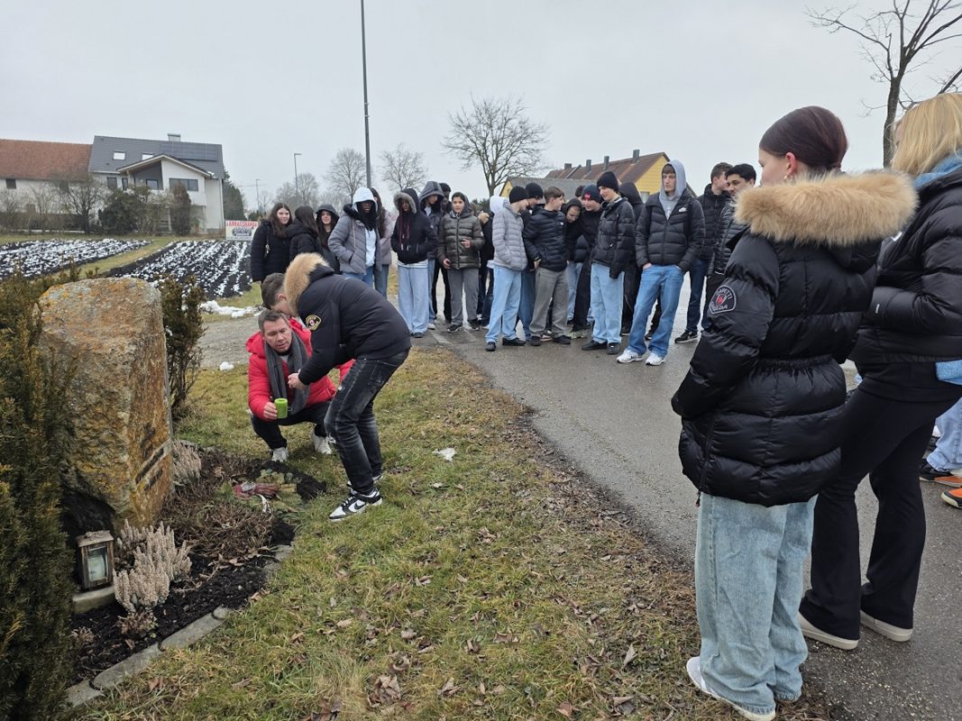 Im Rahmen der schulischen Erinnerungsarbeit besuchten die Klassen 9a (Klassenleiter Johannes Isola) und 9b (Klassenleiter Fynn Jäger) das Mahnmal für die Todesmärsche in Hallbergmoos. Der Besuch bildete den Abschluss einer intensiven dreiwöchigen Unterrichtsreihe zum Thema Gedenkstätten und Nationalsozialismus. Bereits in der Vorwoche hatten beide Klassen die KZ-Gedenkstätte Dachau besucht. Aufbauend auf diesen Eindrücken setzten sich die Schülerinnen und Schüler im Unterricht vertieft mit den sogenannten Todesmärschen auseinander. Dabei wurden historische Hintergründe erarbeitet, Zeitzeugenberichte analysiert und die Bedeutung von Erinnerungskultur diskutiert.