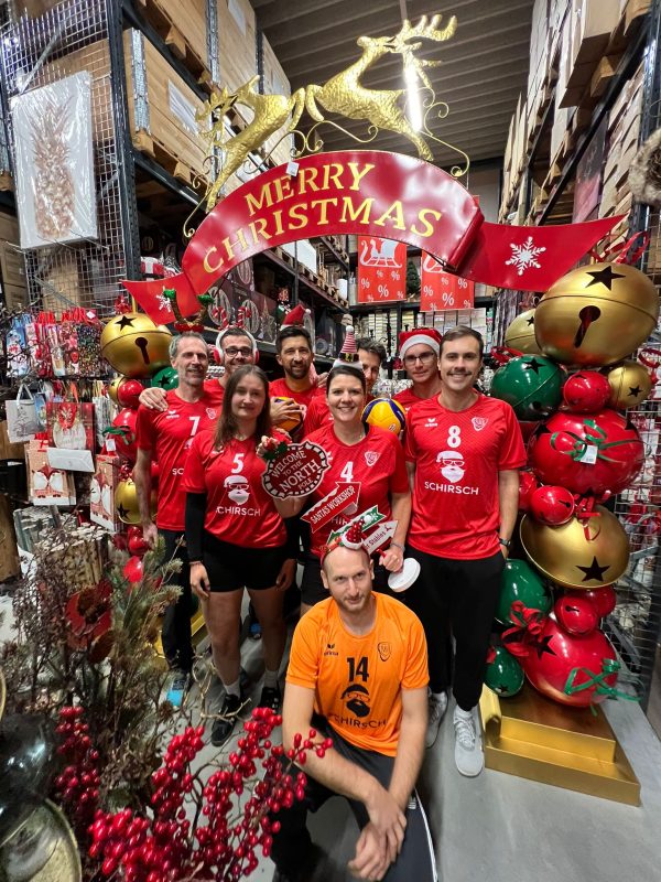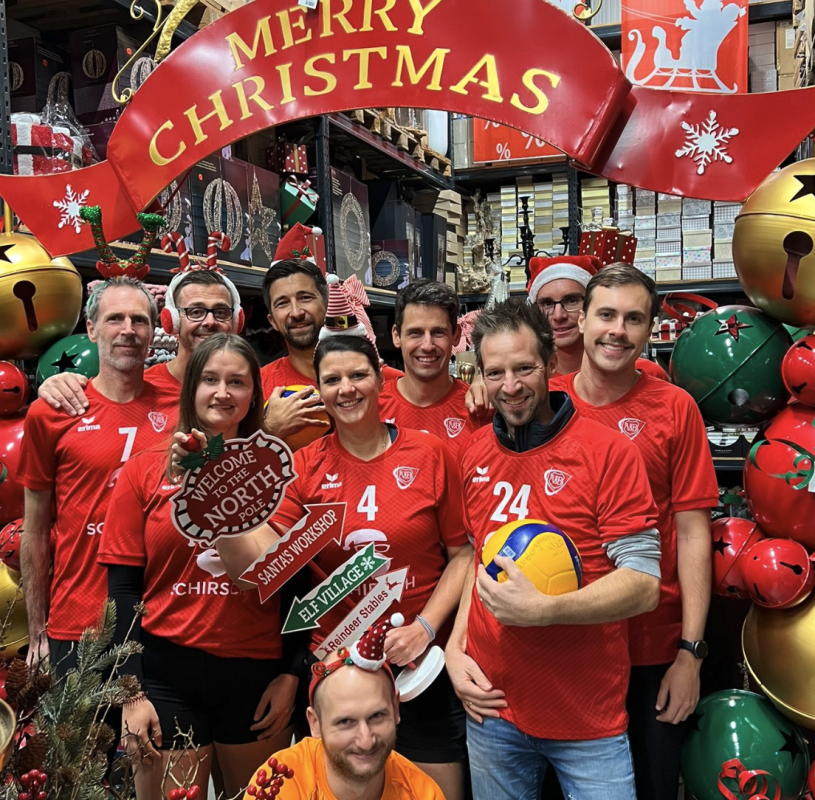 Am 10. November war es endlich so weit. Die 1. Volleyball-Freizeit-Mannschaft des VfB Hallbergmoos konnte stolz ihre neuen Trikots beim neuen Sponsor Schirsch Non-Food-Vertrieb präsentieren. Im tollen Setting des großartigen Weihnachtswunderlands kamen die neuen roten Trikots mit dem Weihnachtsmann-Logo hervorragend zur Geltung. Ab jetzt heißt es: Powered by Schirsch!