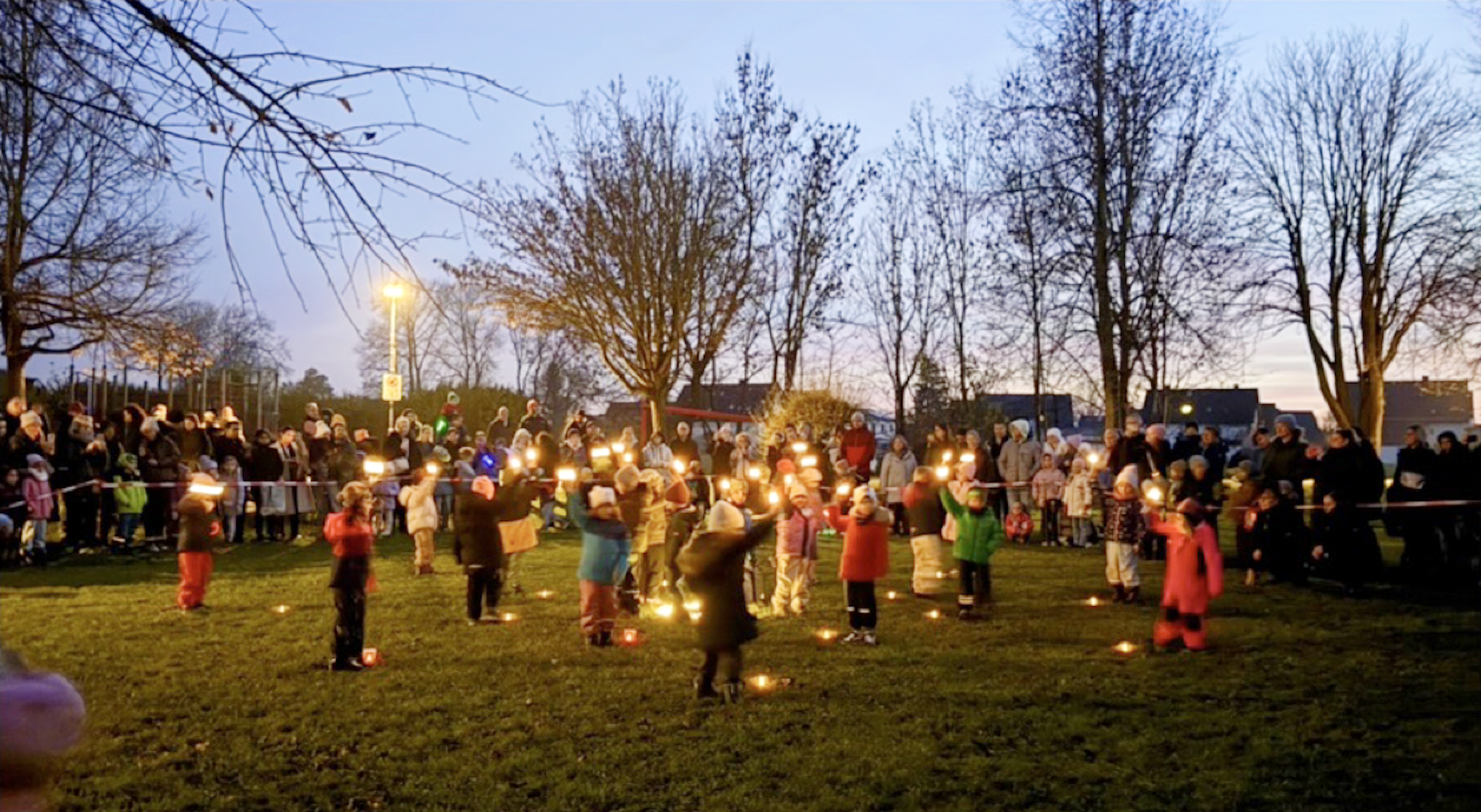 Im Anschluss an das Martinsspiel tanzten die Vorschulkinder ihren traditionellen Lichtertanz. Im Dunkeln, nur mit Kerzen ausgestattet, führten sie eine Choreografie vor, die wochenlang mit den Erzieherinnen einstudiert wurde. Ein Highlight, bei dem das ein oder andere Elternteil ein Tränchen der Rührung verdrückt haben dürfte.