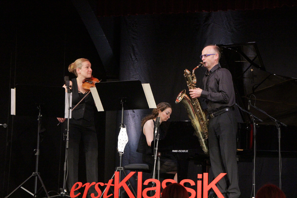 Die ungewohnten Bedingungen waren jedoch schnell vergessen, als das Trio auf die Bühne kam: die Pianistin Margarita Oganesjan, Markus Maier mit seinem Bariton-Saxofon und Rebekka Hartmann, die das Publikum mit ihrer Stradivari-Geige verzauberte.