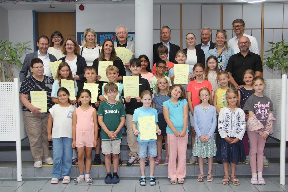 Kurz vor dem Schuljahresende waren wieder alle Paten in die Aula der Schule eingeladen. Die Kinder hatten Urkunden vorbereitet, die alle aus der jeweiligen Klasse unterschrieben hatten und die sie nun ihrem Paten, ihrer Patin überreichten. Anschließend ging’s für die Kinder wieder zurück in die Klasse und für die Erwachsenen in den ersten Stock zu einem Stehempfang. Hier gab es nicht nur einen kleinen Imbiss, sondern vor allem auch Informationen zu „Klasse 2000“. Die Patinnen und Paten erfuhren nicht nur Details über das Programm, sondern auch interessante Zahlen, z.B., dass im Schuljahr 2024/25 rund 22.300 Klassen mitmachen konnten, was die beachtliche Zahl von 488.000 Schülerinnen und Schülern bedeutet. Finanziert wird das Ganze von fast 4.700 Patinnen und Paten.