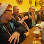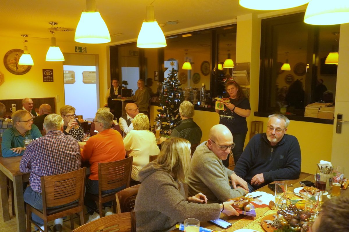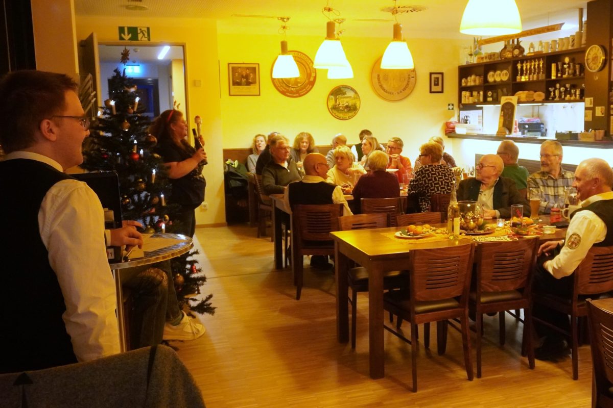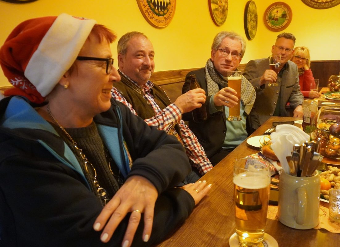 Die Mitglieder der SG Edelweiß zeigen viel Spaß beim Bietergefecht ihrer Christbaumversteigerung.
