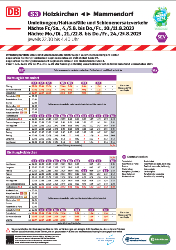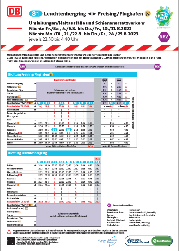 Wegen Bauarbeiten am Isartor auf der Stammstrecke, kommt es in den Nächten Freitag/Samstag, 4./5. bis Donnerstag/Freitag, 10./11. August 2023 und Montag/Dienstag, 21./22. Bis Donnerstag/Freitag, 24./25. August 2023 (jeweils 22:30 bis 4:40 Uhr) zwischen Ostbahnhof und Pasing zu Fahrplanänderungen mit Umleitungen/Haltausfällen und Schienenersatzverkehr.