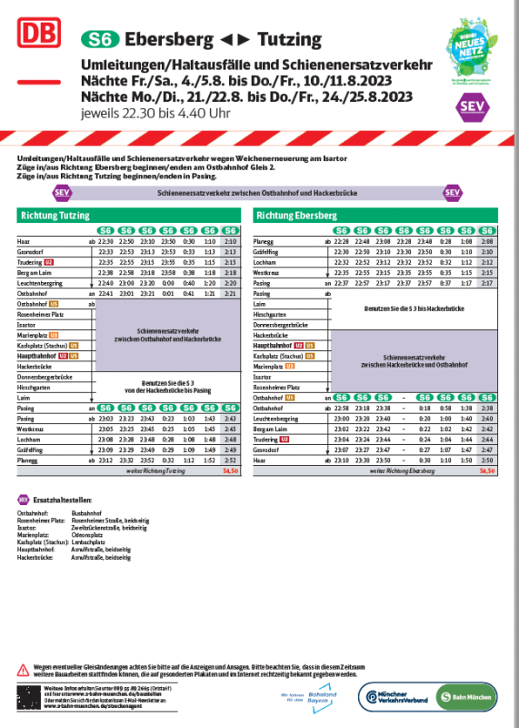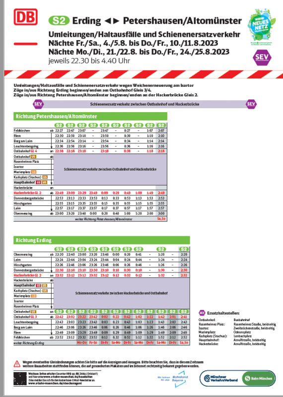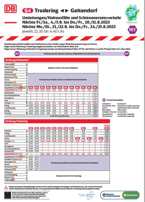 – S 4: Züge in/aus Richtung Geltendorf beginnen/enden am Hauptbahnhof und fahren von/bis Pasing ohne Halt, zwischen Pasing und Trudering fallen die Züge aus.