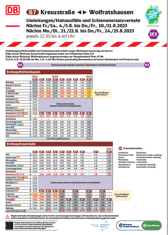 – S 7: Züge in/aus Richtung Wolfratshausen beginnen/enden am Hauptbahnhof Gleis 27-36, kein Halt Hackerbrücke.