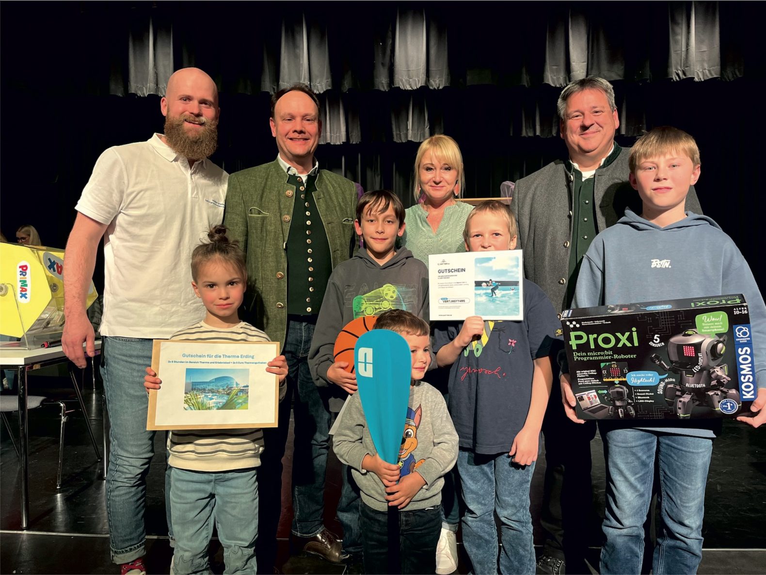 Der absolute Höhepunkt des Nachmittags war die Preisverleihung, moderiert von Christoph Lutz, die für leuchtende Kinderaugen sorgte. Von kleinen Überraschungen bis hin zu wertvollen Hauptpreisen war für jeden etwas dabei. Der erste Platz war ein Preis von 100 Euro, der durch eine sportliche Herausforderung – fünf gezielte Würfe auf einen Basketballkorb – auf 200 Euro erhöht werden konnte. Das glückliche Gewinnerkind erzielte, mit Hilfe seines Bruders, den Höchstbetrag und zog den Jubel der Zuschauer auf sich. Der zweite Platz war ein Stand Up Paddle, der dritte Platz umfasste zwei Eintrittsgutscheine für je 6 Stunden in die Therme Erding, der vierte Preis war eine Surfsession in der Surftown Hallbergmoos und der fünfte Hauptpreis war ein Programmier-Roboter von Kosmos. Unter den 100 Gewinnen befanden sich zudem Preise wie z.B. Fußbälle, Gesellschaftsspiele, eine ferngesteuerte Riesenspinne, ein Tischkicker sowie viele In- und Outdoorspiele.