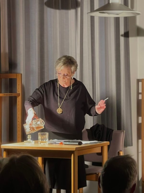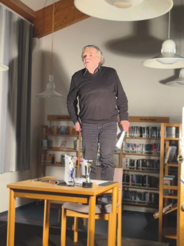 „Requisiten, gezielte Beleuchtung, durch die das gesprochene Wort in den Mittelpunkt rückte. Kleine szenische Elemente lockerten den Ablauf auf, darunter ein Papierflieger, der über das Publikum segelte, sowie Passagen in denen Herr Weissthanner im Publikum, oder auf seinem Stuhl stand. Diese Momente lösten leises Gelächter im Publikum aus, bevor die Lesung wieder in stillere und nachdenklichere Stimmung zurückkehrte. Nach etwa 50 Minuten gab es eine kurze Pause mit kleinen Snacks und Getränken. Am Ende bedankte sich die Bücherei beim Ensemble und überreichte Blumen als Zeichen der Wertschätzung. Die Veranstaltung endete mit langem Applaus.