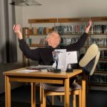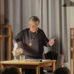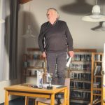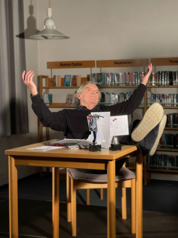 „Requisiten, gezielte Beleuchtung, durch die das gesprochene Wort in den Mittelpunkt rückte. Kleine szenische Elemente lockerten den Ablauf auf, darunter ein Papierflieger, der über das Publikum segelte, sowie Passagen in denen Herr Weissthanner im Publikum, oder auf seinem Stuhl stand. Diese Momente lösten leises Gelächter im Publikum aus, bevor die Lesung wieder in stillere und nachdenklichere Stimmung zurückkehrte. Nach etwa 50 Minuten gab es eine kurze Pause mit kleinen Snacks und Getränken. Am Ende bedankte sich die Bücherei beim Ensemble und überreichte Blumen als Zeichen der Wertschätzung. Die Veranstaltung endete mit langem Applaus.