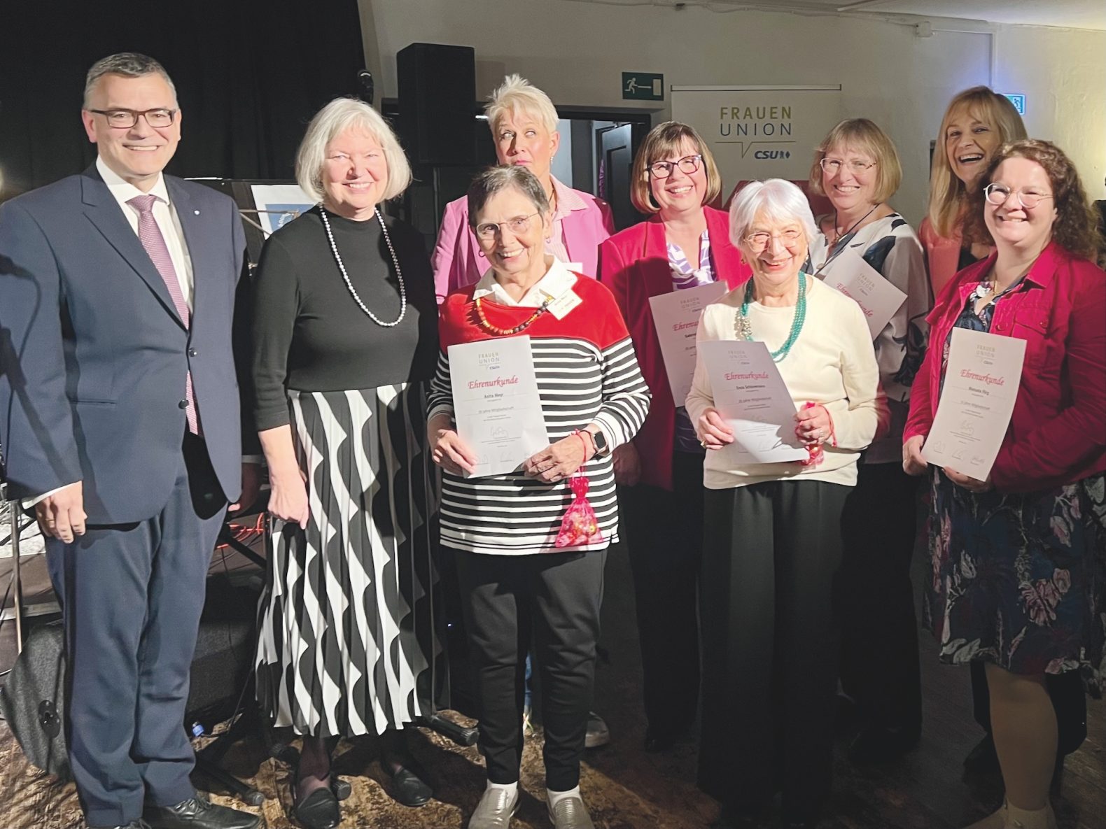 Die Damen der Frauen Union Hallbergmoos-Goldach und Ehrengäste, die für mehrjährige Mitgliedschaft und Engagement ausgezeichnet wurden!: v.l.n.r.: Dr. Florian Herrmann, Staatsminister und Kreisvorsitzender CSU FS, Monika Hermann, stellv. Kreisvorsitzende FU FS, Anita Meyr, Sylvia Merczak, Schriftführerin, Gabriele Partsch, 1. Vorsitzende FU, Enza Schünemann, Petra Elsenberger, Anita, Kreillinger und Manuela Förg.