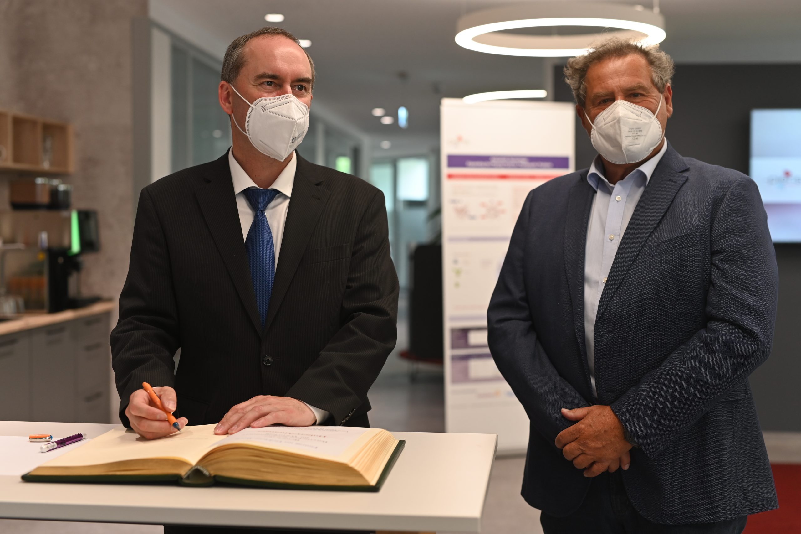 Bei seinem Besuch in Hallbergmoos trug sich Staatsminister Hubert Aiwanger (li.) auch in das Goldene Buch der Gemeinde ein, rechts 2. Bürgermeister Helmut Ecker